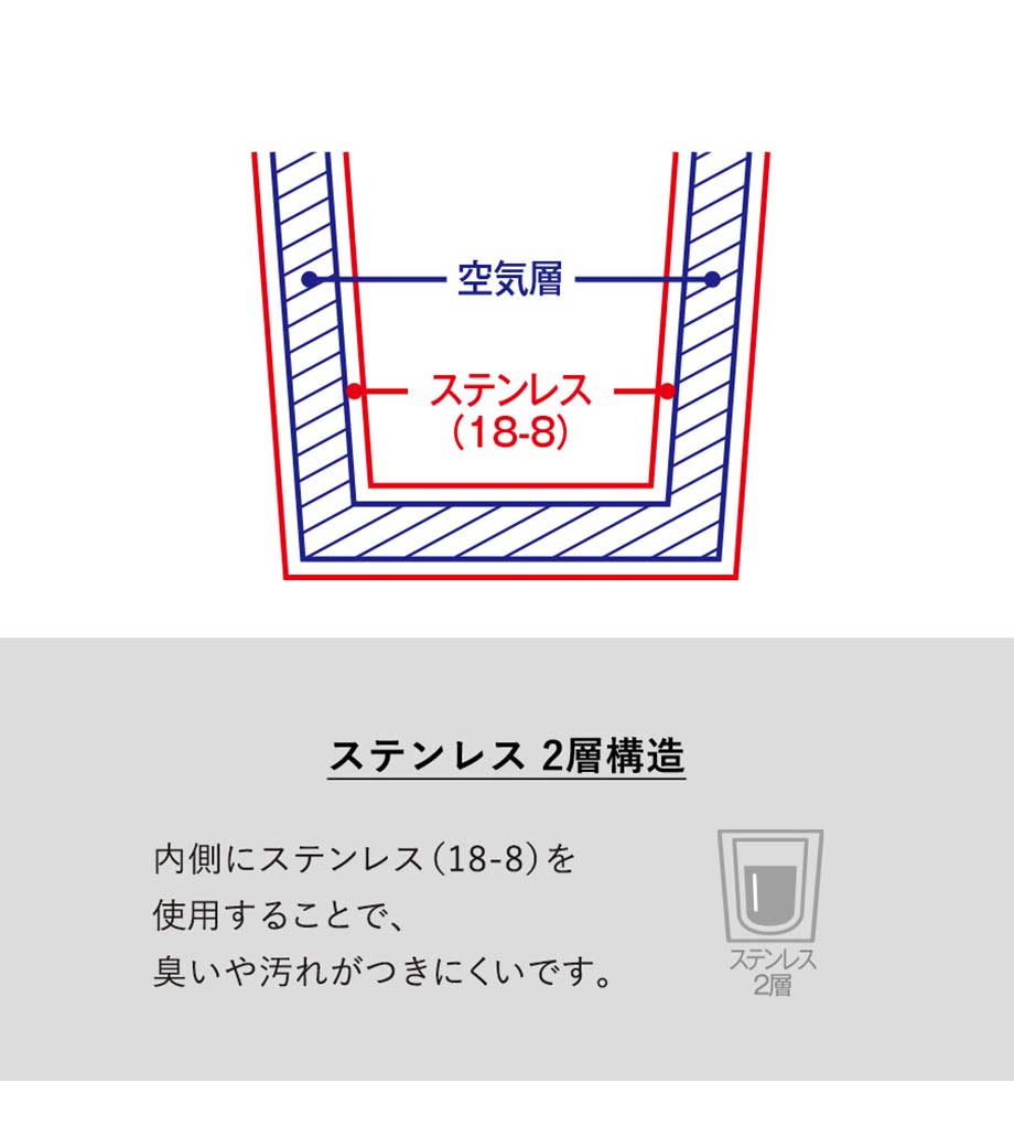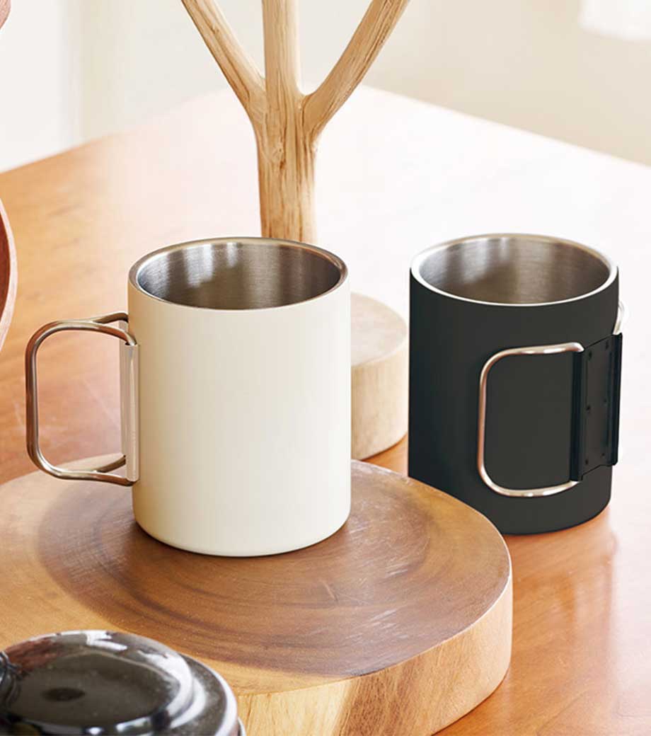 ステンレス二重構造で温度が変わりにくい、サーモタイプのマグカップもご用意。フタ付ならさらに保冷保温機能が増すうえ、気になるほこり予防にも役立ちます。