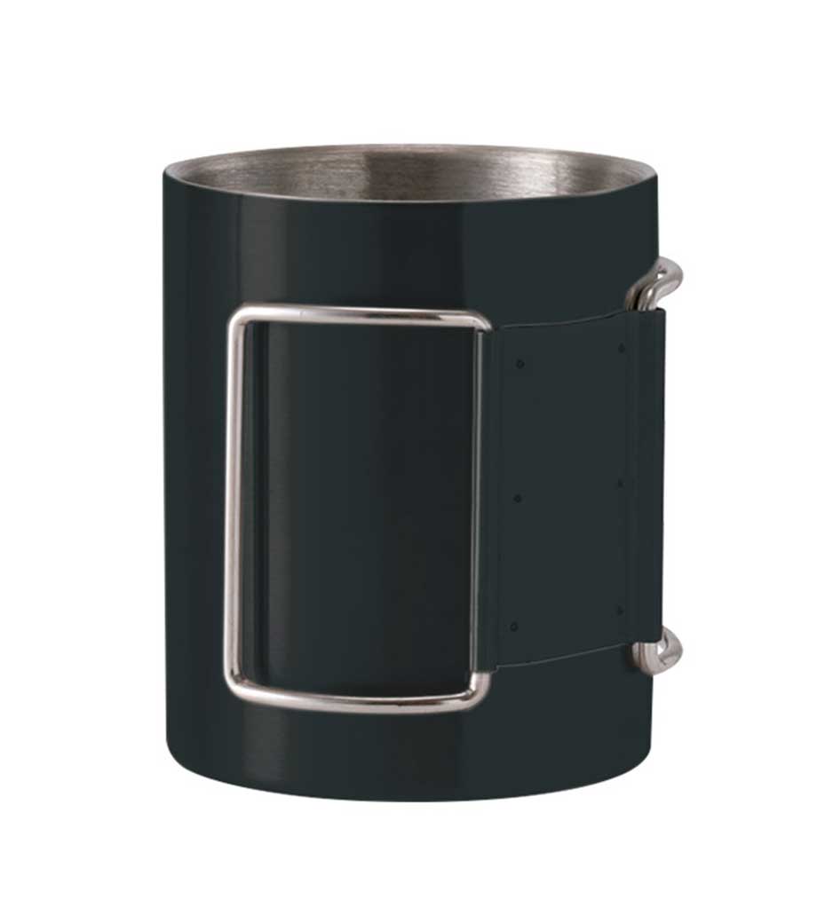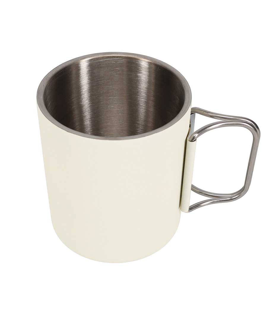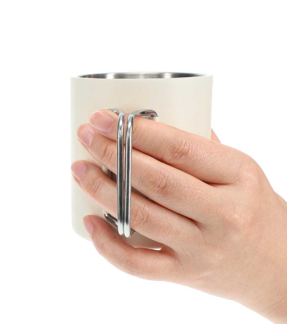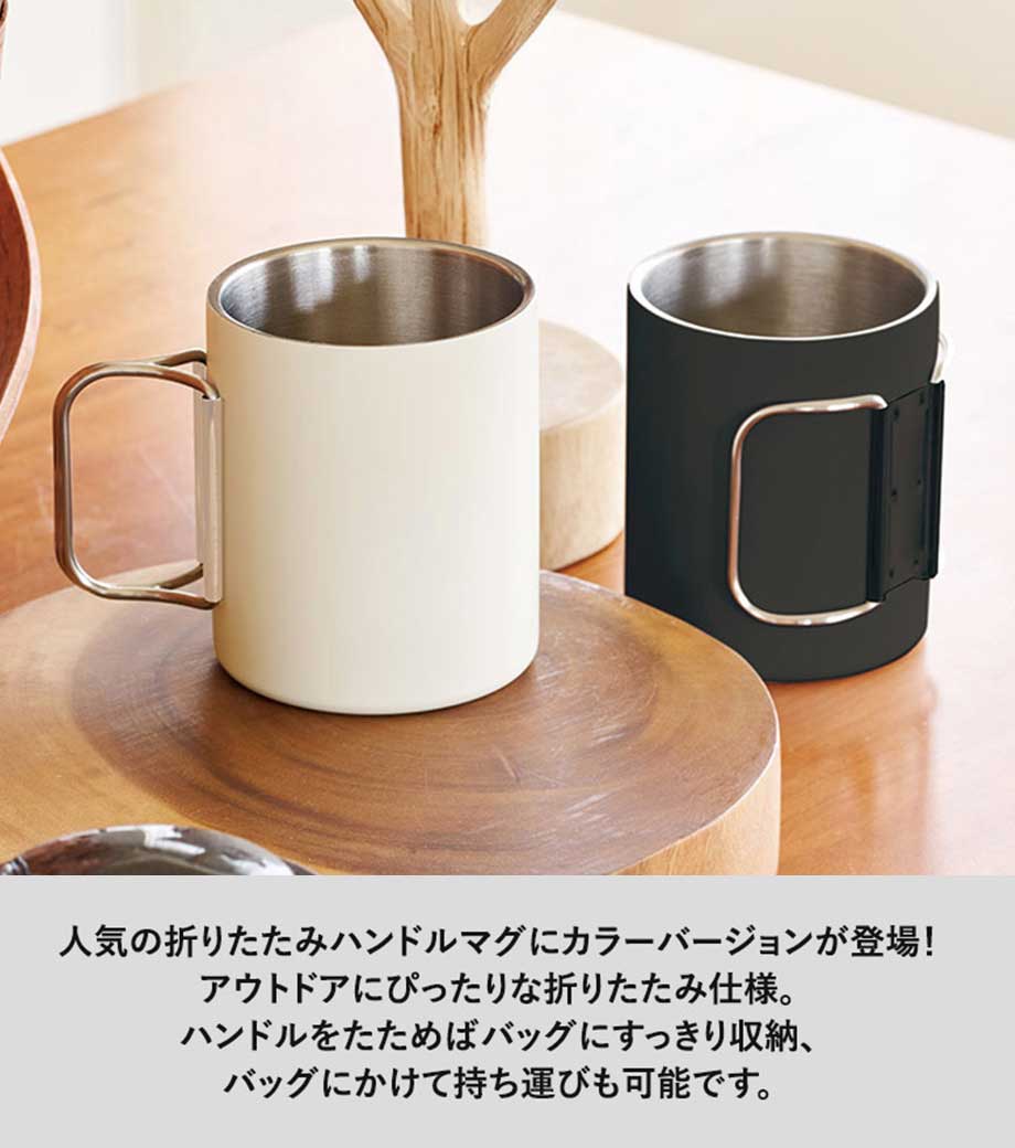 折りたたみカラビナハンドルステンレスマグは、持ち手が折りたためるカラビナになっているステンレス製マグカップ。リュックに引っ掛ければ登山やキャンプの持ち運びに便利です。結露しにくい2重構造(真空タイプではありません)で内側は錆にも強い18-8ステンレス製。使いやすい270mlの手頃なサイズ感も魅力です。収納時もハンドルが邪魔にならず、屋外での使用に最適なステンレスマグカップです。