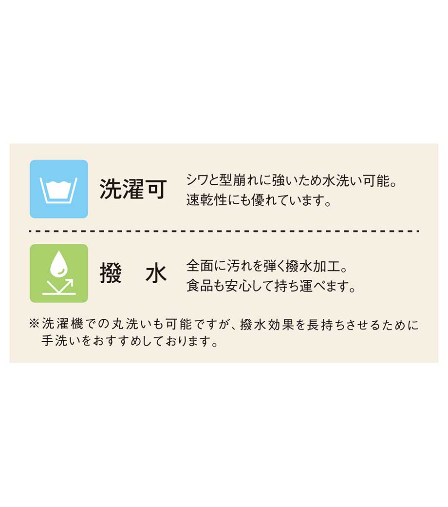 テントクロス折りたたみトートは雨や汚れを弾く撥水加工。軽量なポリエステル素材でコンパクトに収納できるので持ち歩きもラクラク。2Lペットボトルが縦に余裕をもって入る大きさです。内ポケットに小さく畳んで携帯にも便利。使用時にはスマホなどちょっとした小物を入れておけます。