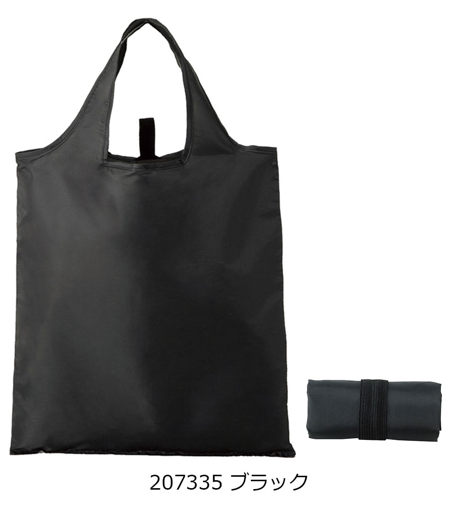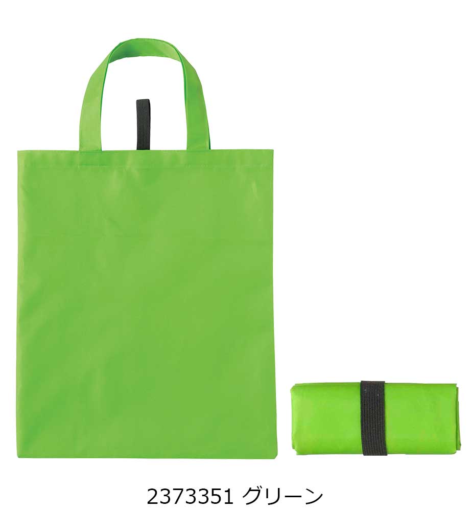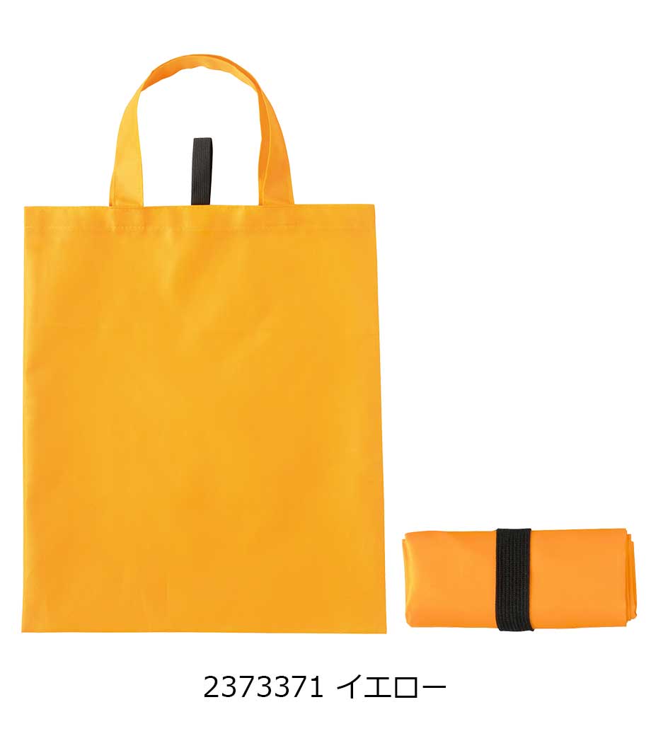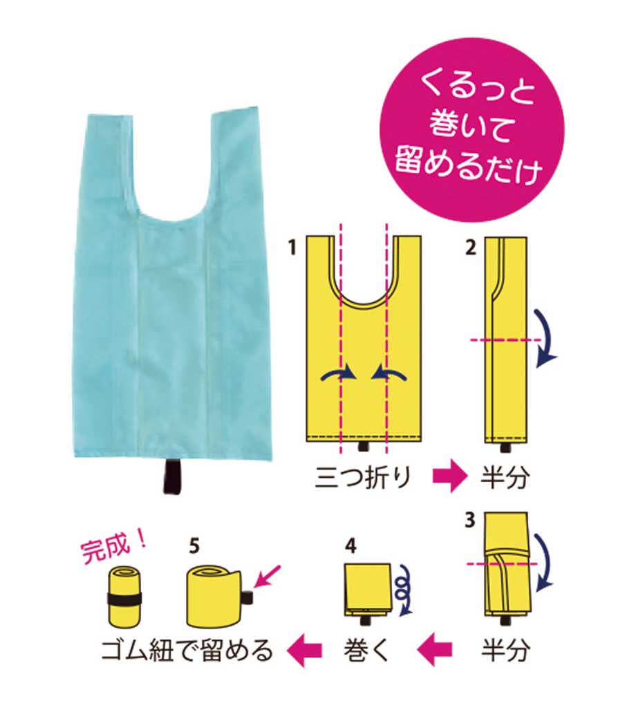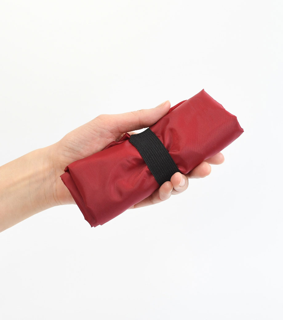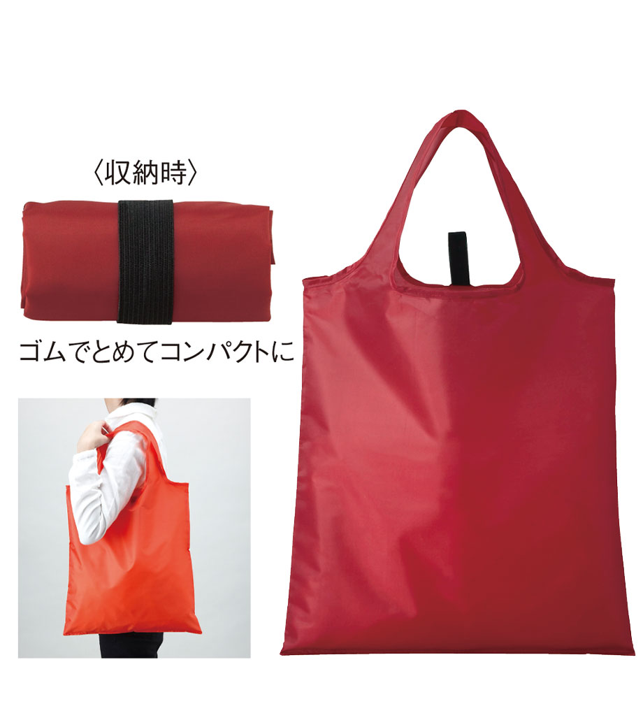 ゴムバンド付きのポリエステル製エコバッグ。くるっと畳んでゴムバンドで留めれば、手のひらサイズに早変わり。カバンの中でもかさばらず、持ち運びに便利です。肩にかけられる持ち手で、重い荷物も持ちやすいのがうれしいですね。