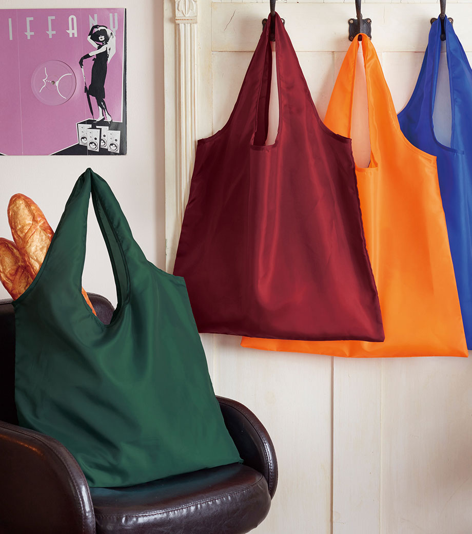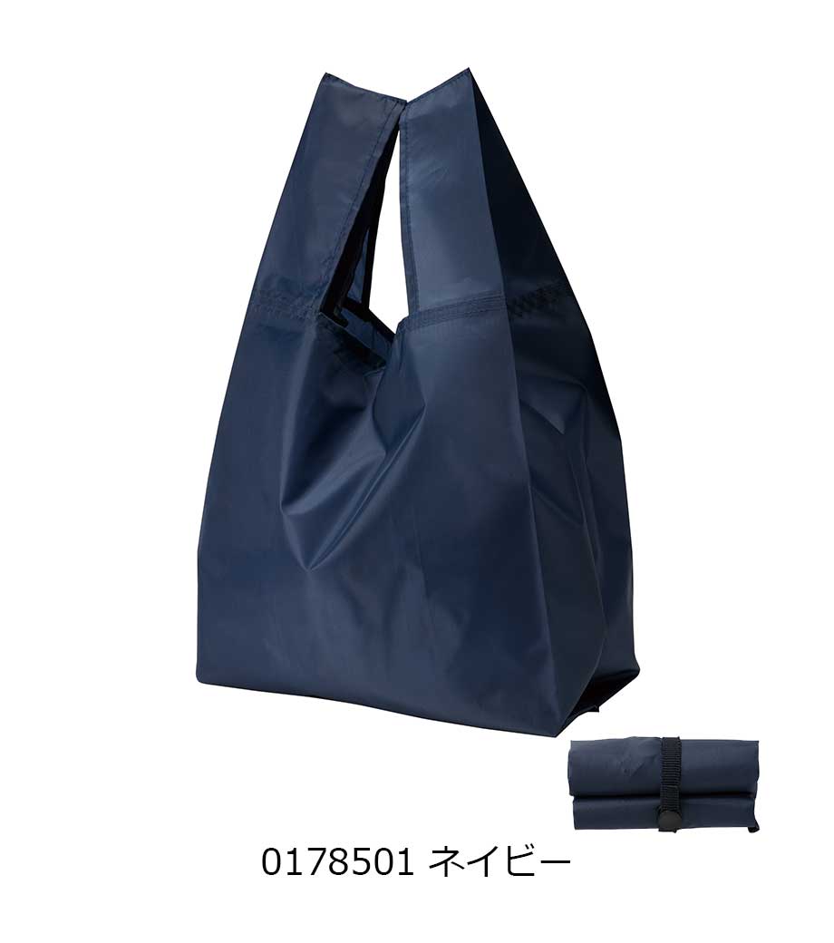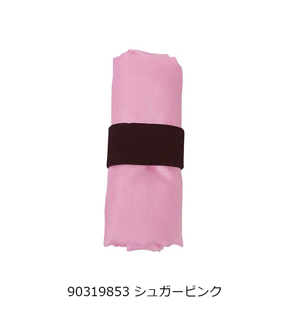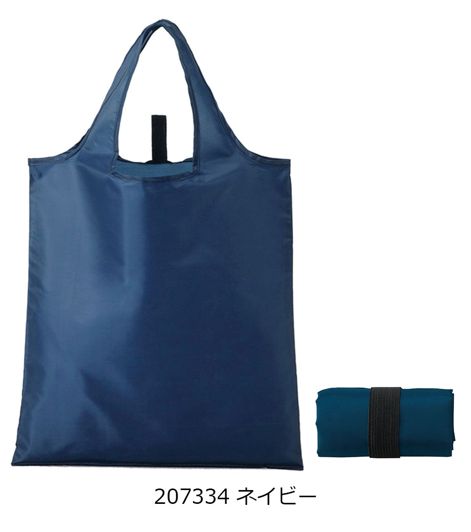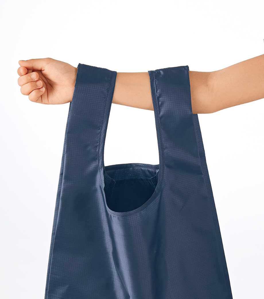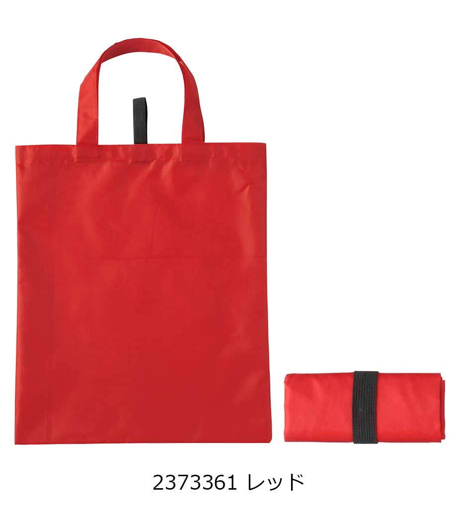 ゴムバンド付きのポリエステル製エコバッグ。くるっと畳んでゴムバンドで留めれば、手のひらサイズに早変わり。カバンの中でもかさばらず、持ち運びに便利です。肩にかけられる持ち手で、重い荷物も持ちやすいのがうれしいですね。