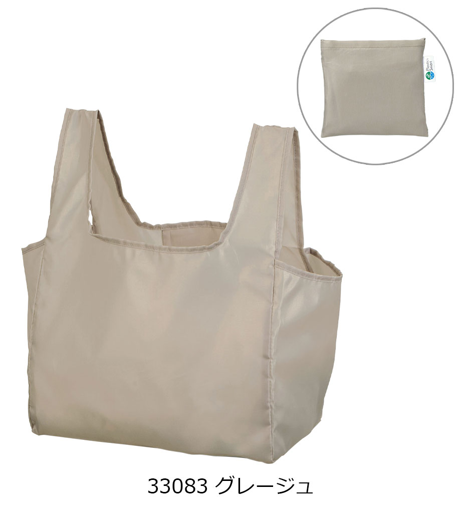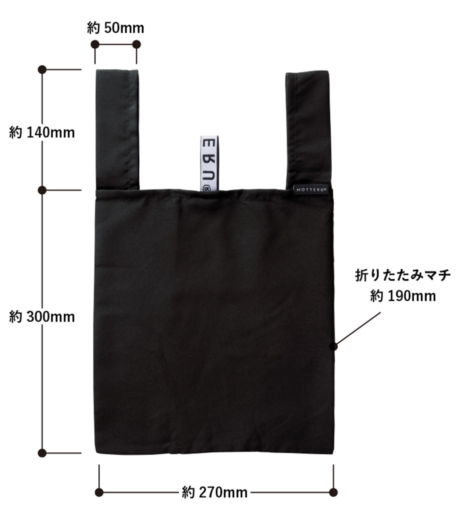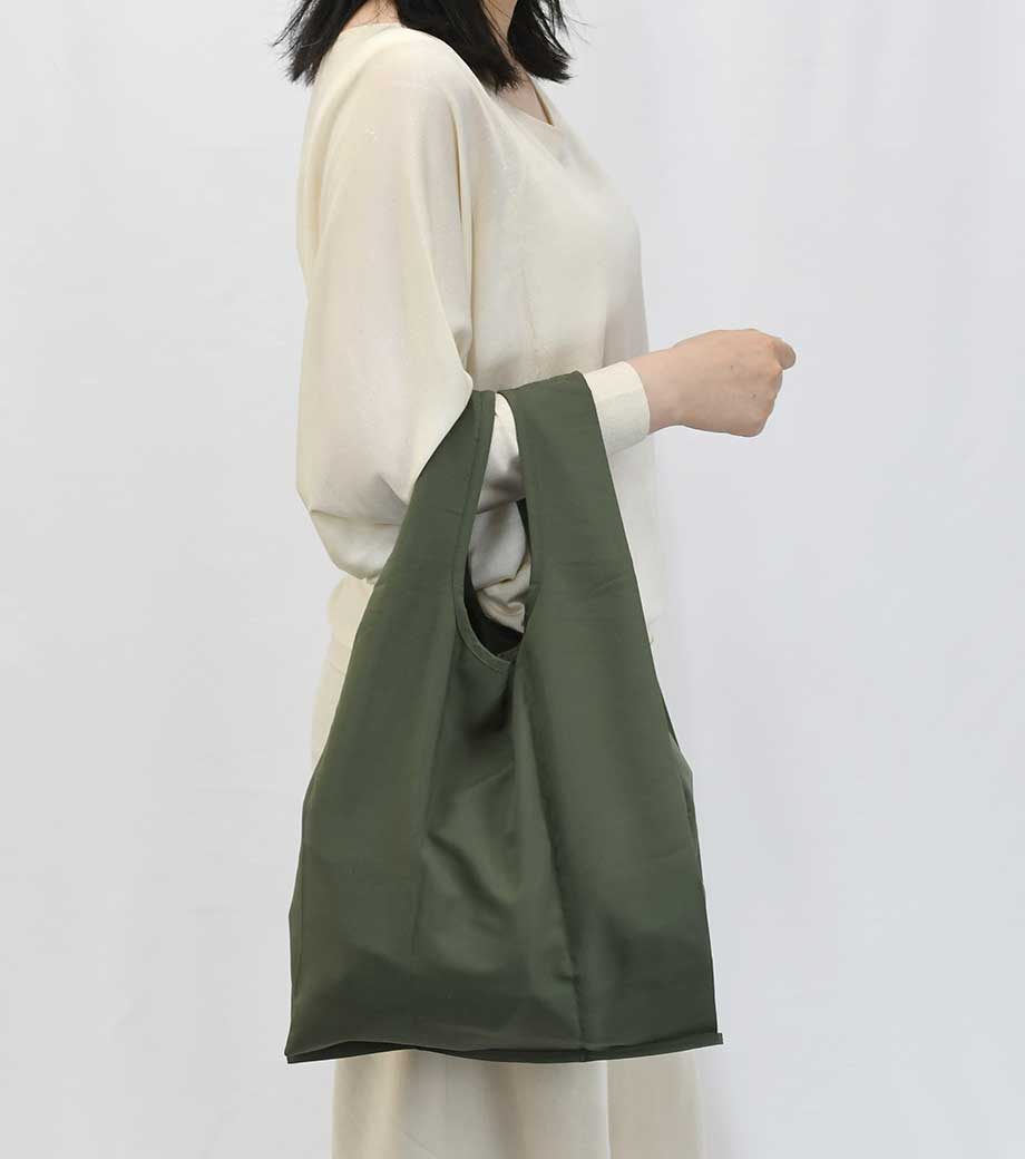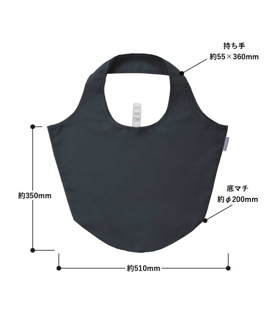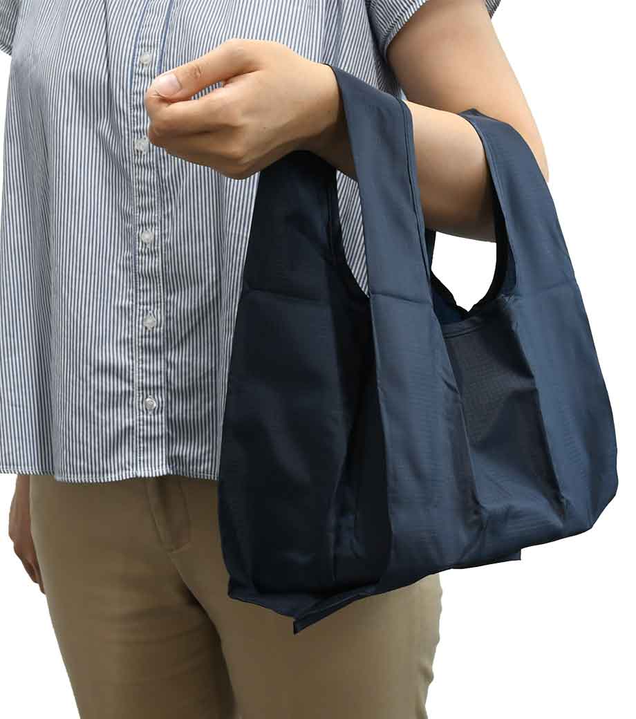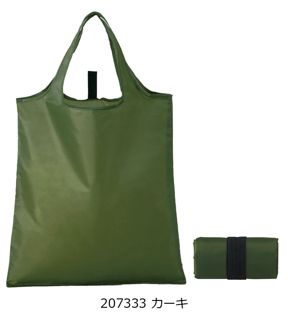 ゴムバンド付きのポリエステル製エコバッグ。くるっと畳んでゴムバンドで留めれば、手のひらサイズに早変わり。カバンの中でもかさばらず、持ち運びに便利です。肩にかけられる持ち手で、重い荷物も持ちやすいのがうれしいですね。