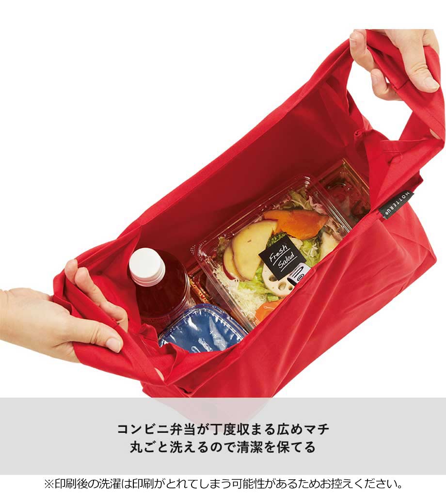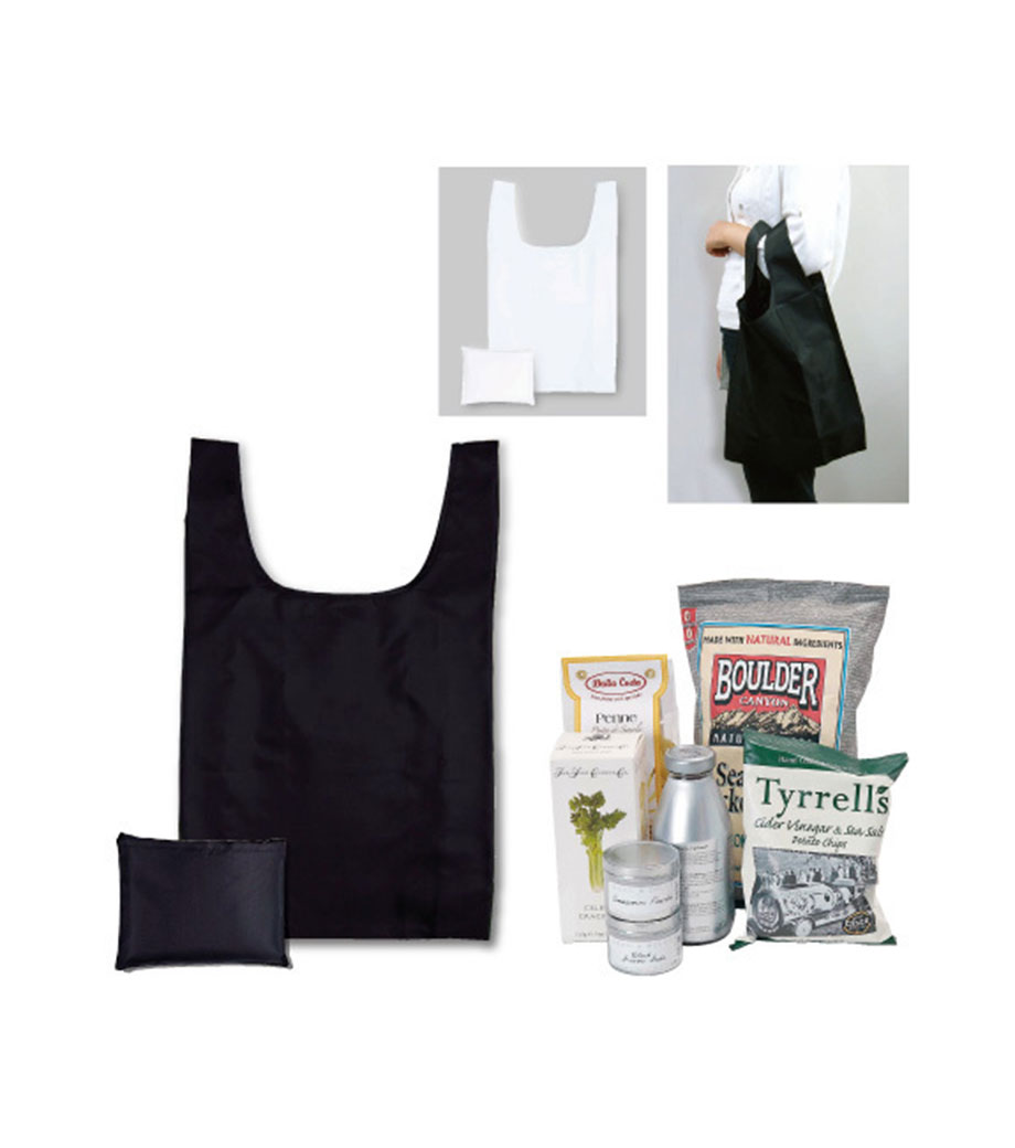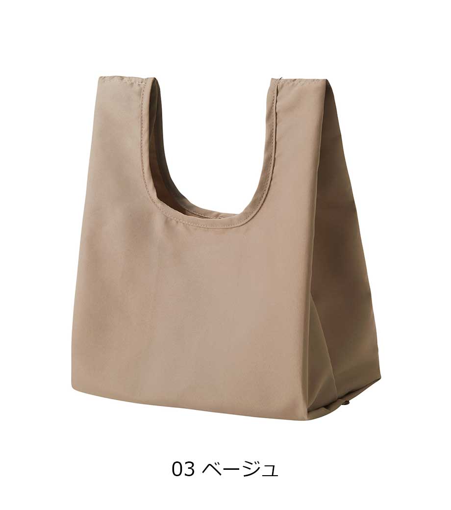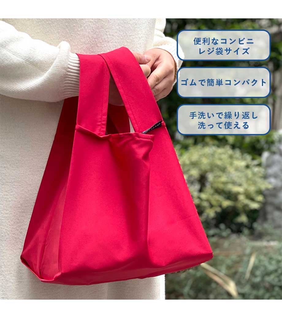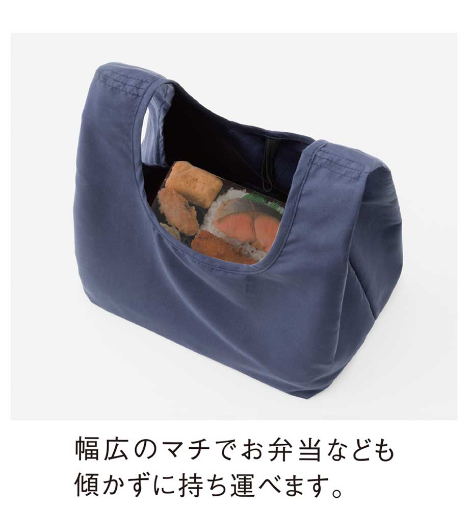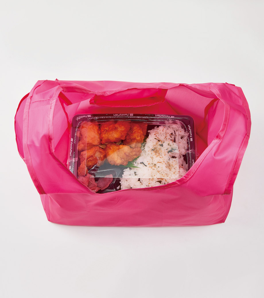 コンビニ弁当を水平に入れることができるレジ袋型で、ランチタイムの買い出しやサブバッグにピッタリ!使わないときは折りたたんでくるっとコンパクトに。携帯に便利です。