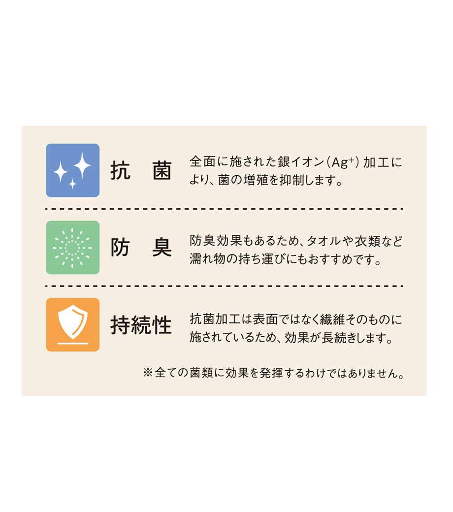 生地の繊維自体に抗菌加工を施し、抗菌効果が長続き。防臭効果もあるため、濡れた衣類やタオルの持ち運びにもオススメ!