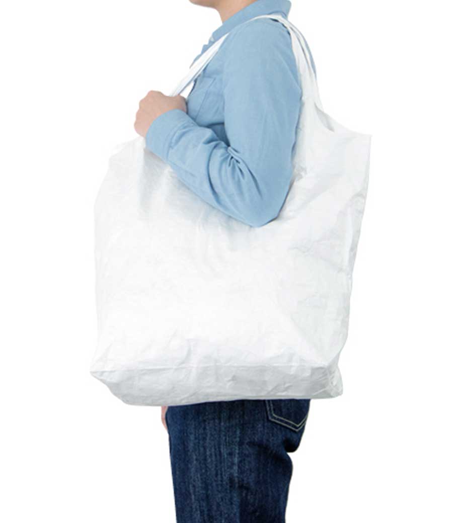 マルシェバッグL(タイベック製)は、表地にタイベック(R)を使用したエコバッグ。タイベック(R)はアメリカ・デュポン社が開発した高密度ポリエチレン製の不織布です。紙のように軽く、水に強く、強度があり、通気するのが特徴です。