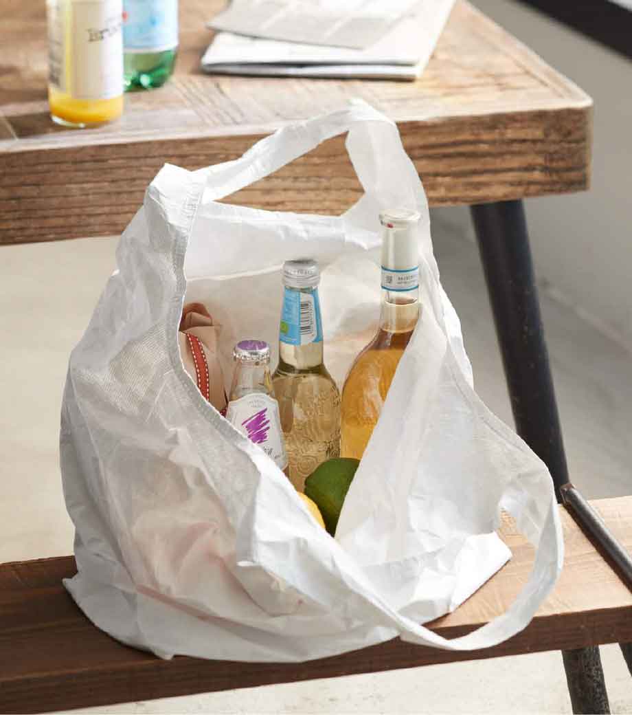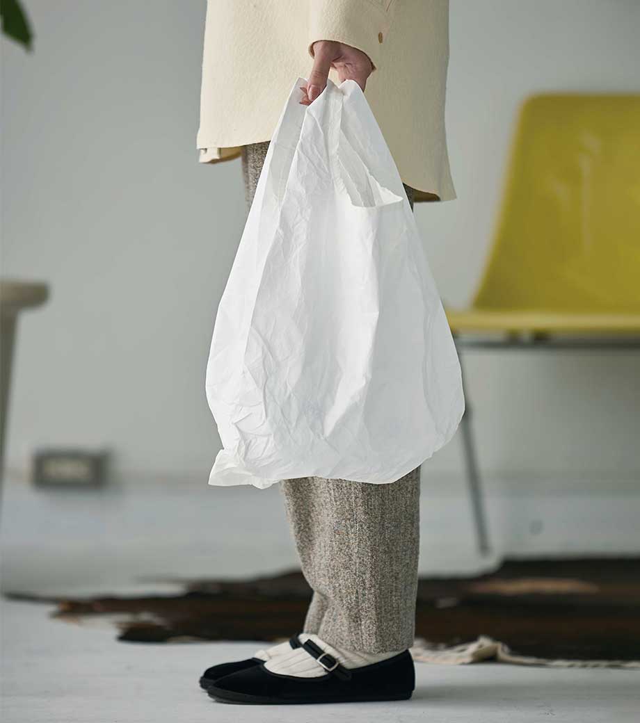 レジ袋が有料になり、エコバッグを持ち歩く人も増えました。でも、通勤通学の荷物のほかにかさばったり重たいエコバッグは持ち歩きたくないと思いませんか?マルシェバッグL(タイベック製)はわずか約27g。小ぶりのピーマン1個とほぼ同じ重さです!折りたためば小さなポーチ状になるので、毎日のお買い物のエコバッグとしてバッグに携帯するのがオススメです。使い込むほどにシワが増え、愛着がわきますよ。