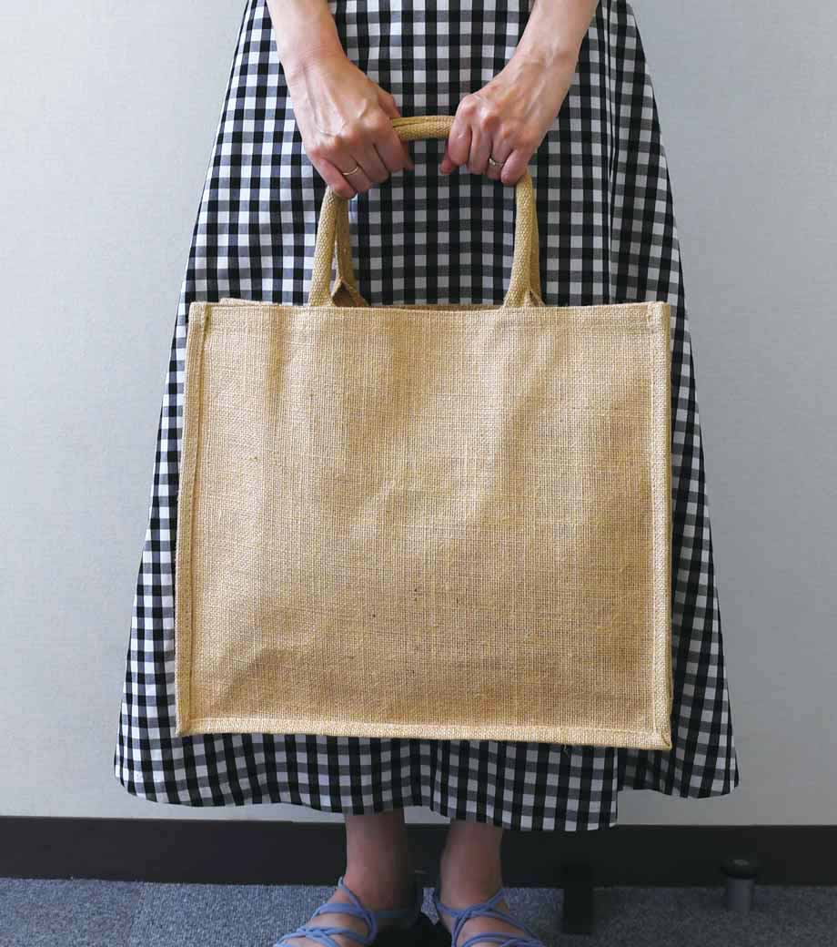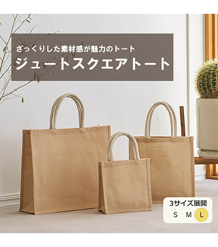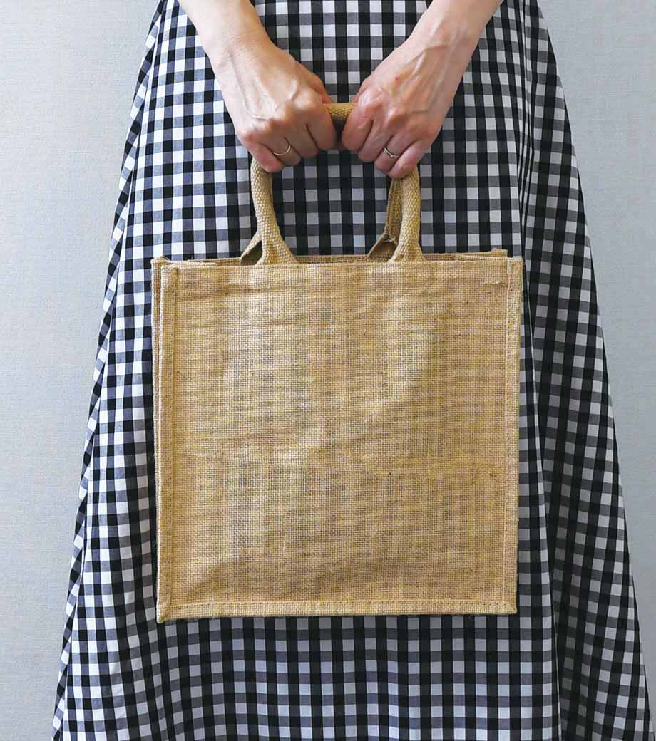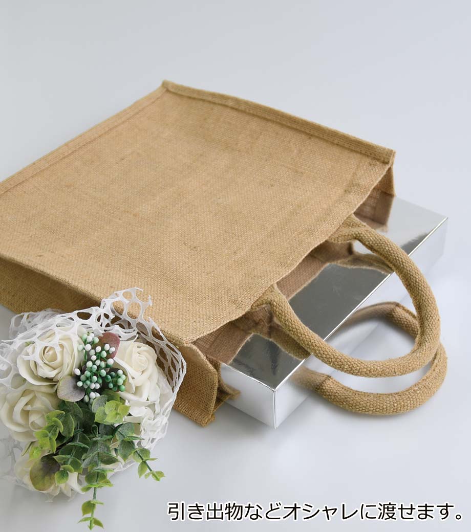 ジュートバッグは、ナチュラルな風合いが楽しめるトートバッグ。四角い底マチで箱もそのまま入るので、贈り物や引き出物などのお渡し用に人気です。ざくっとした素朴な素材感は、カジュアルでおしゃれ。普段使いのバッグとしても持ち歩けます。