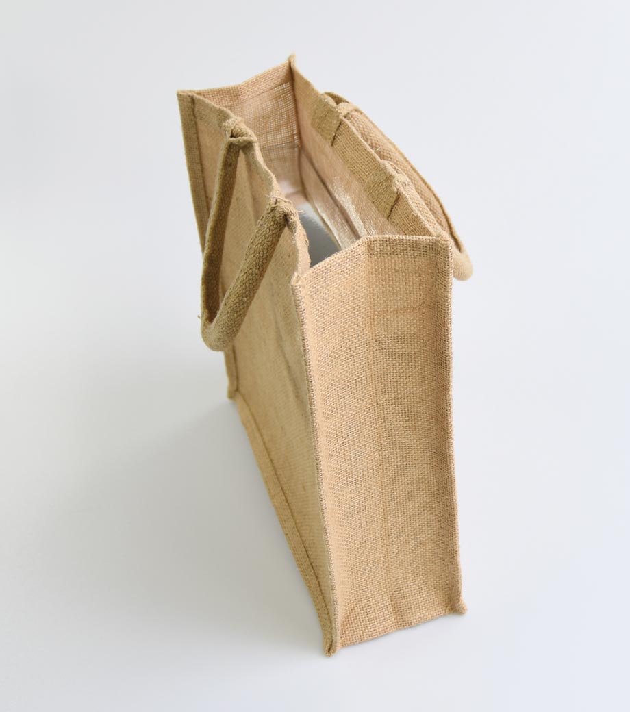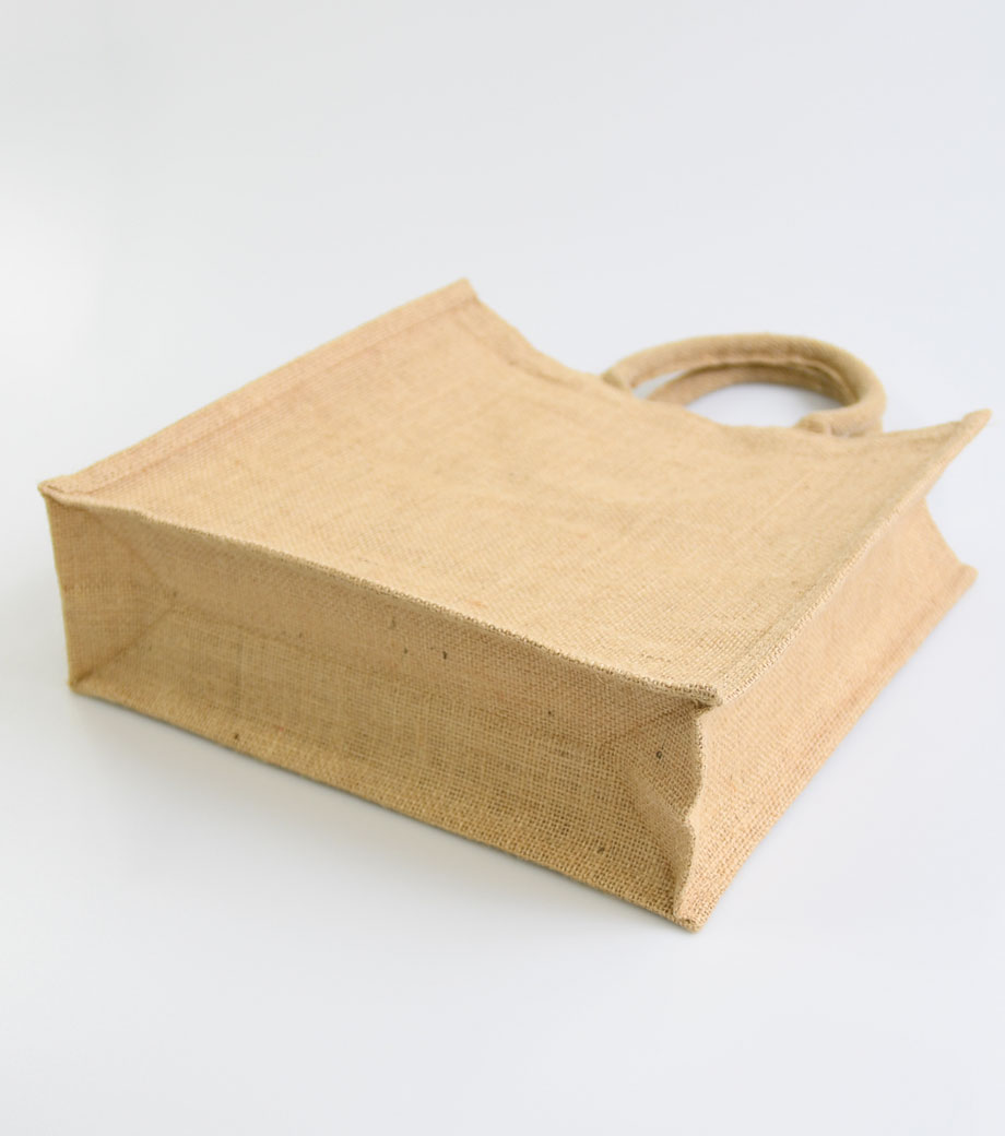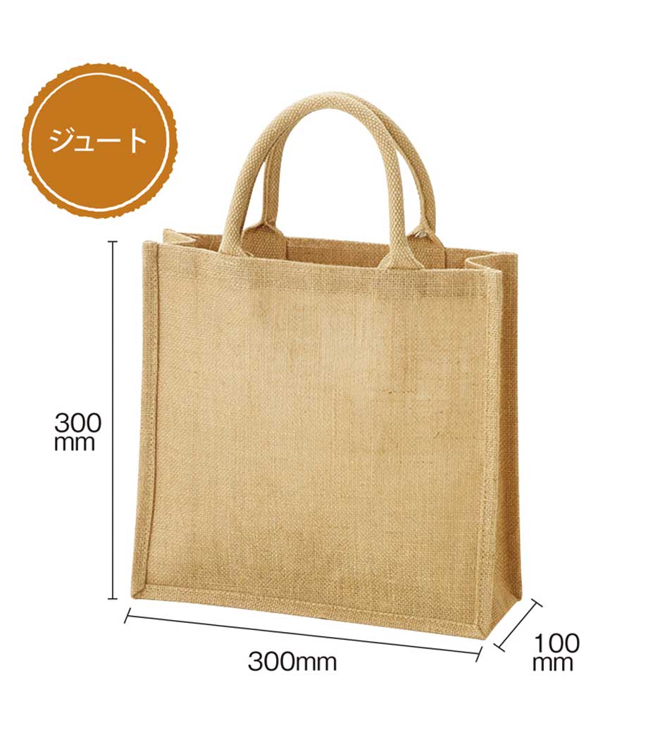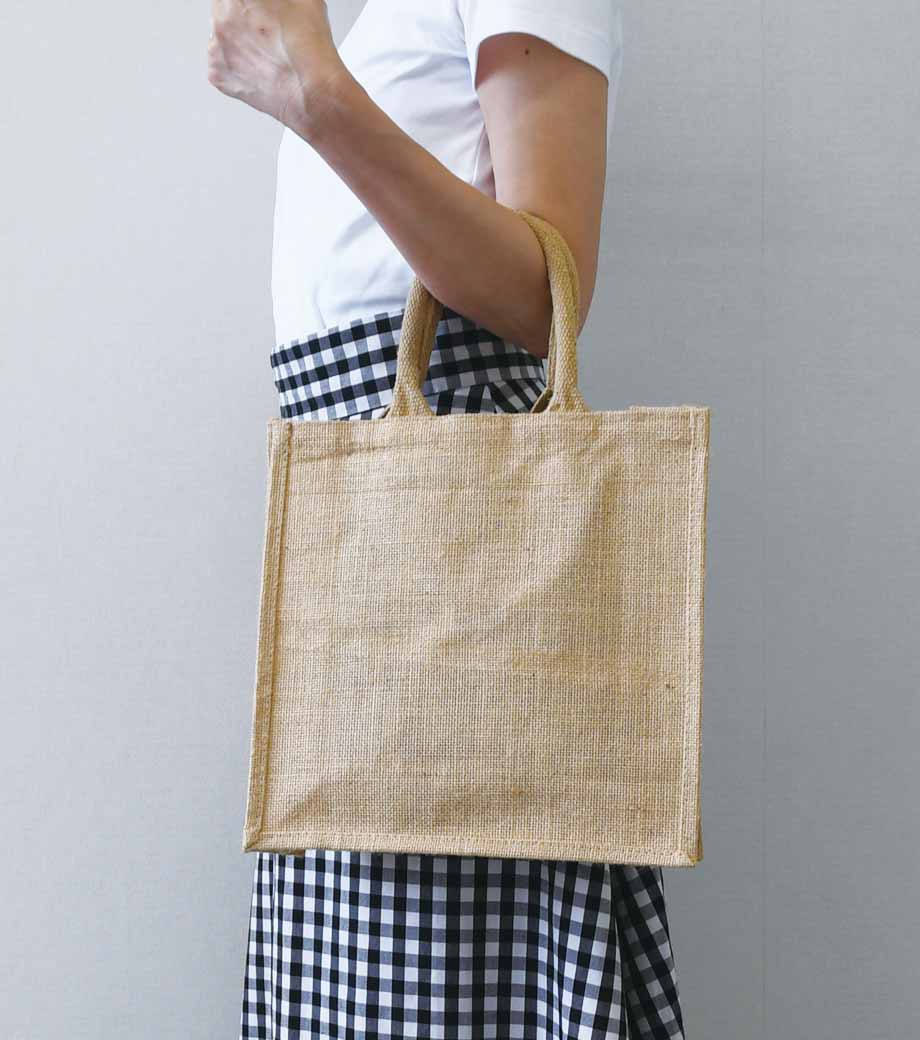 ジュートバッグは、ナチュラルな風合いが楽しめるトートバッグ。四角い底マチで箱もそのまま入るので、贈り物や引き出物などのお渡し用に人気です。ざくっとした素朴な素材感は、カジュアルでおしゃれ。普段使いのバッグとしても持ち歩けます。