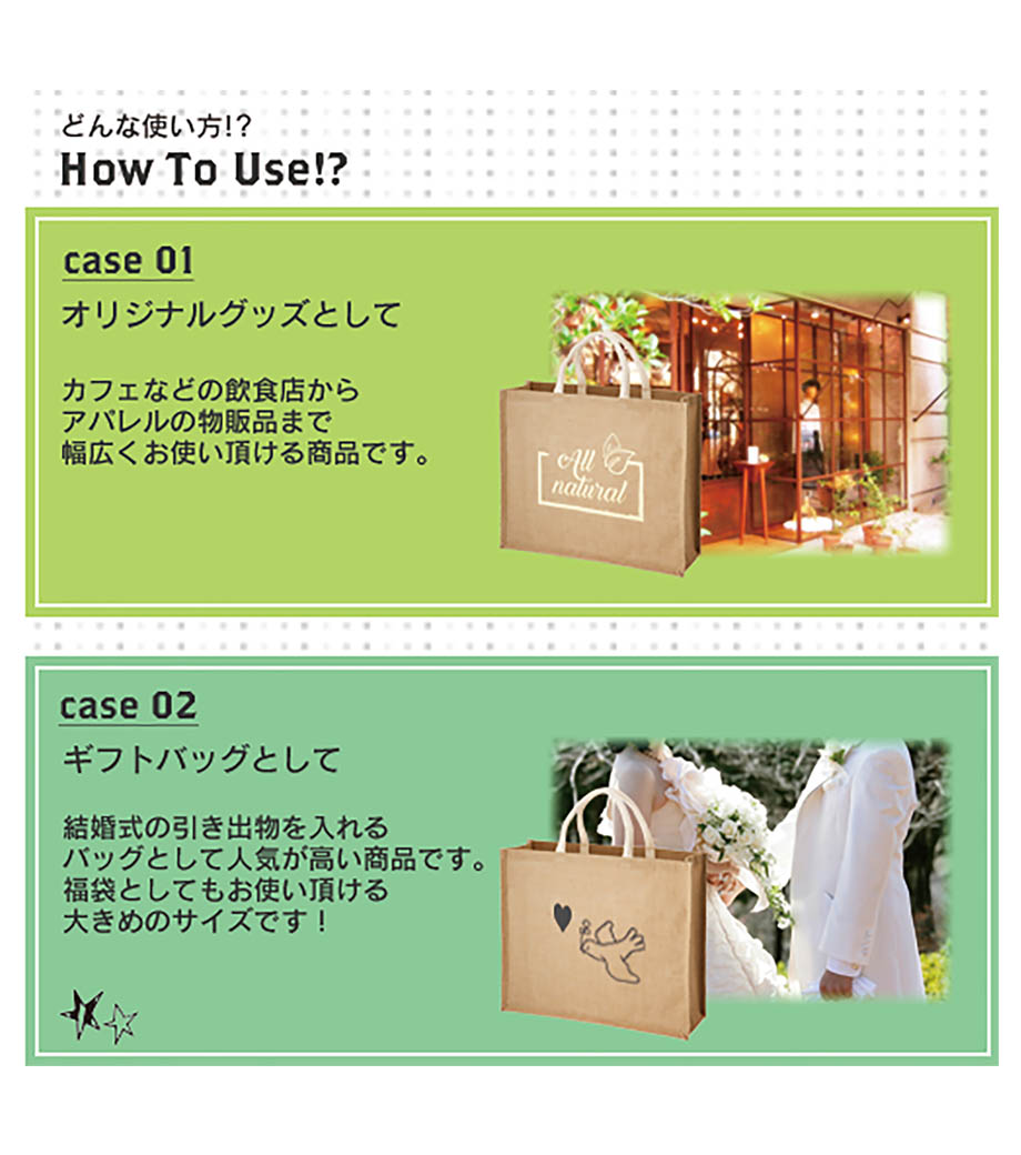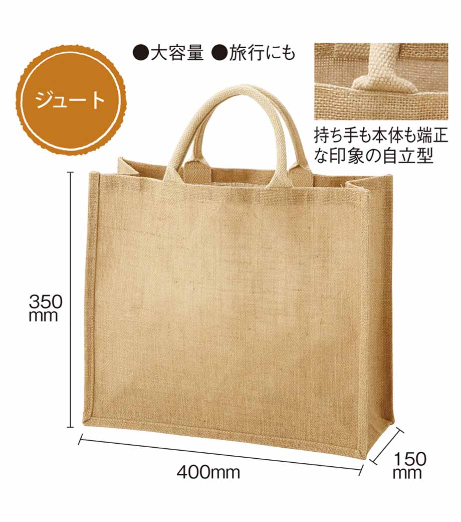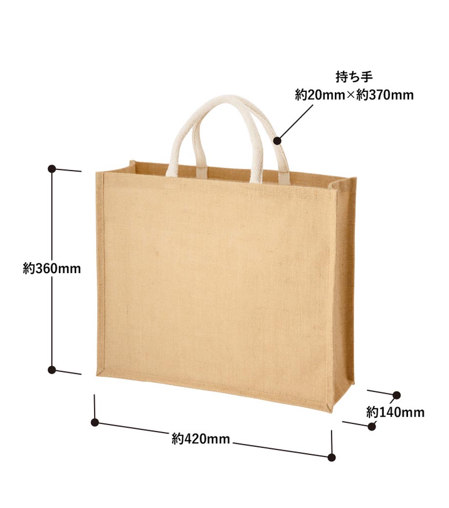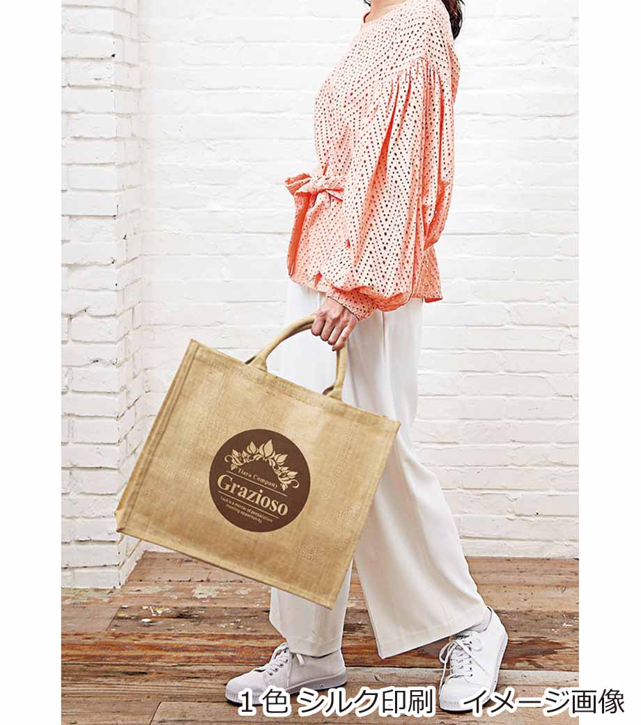 ジュートラージバッグは、ナチュラルな風合いが楽しめるトートバッグです。肩掛けできる四角い底マチ。箱もそのまま入るので、記念品などの贈り物や引き出物のお渡し用に。ざくっとした素朴な素材感がおしゃれな、普段使いもできるカジュアルバッグです。