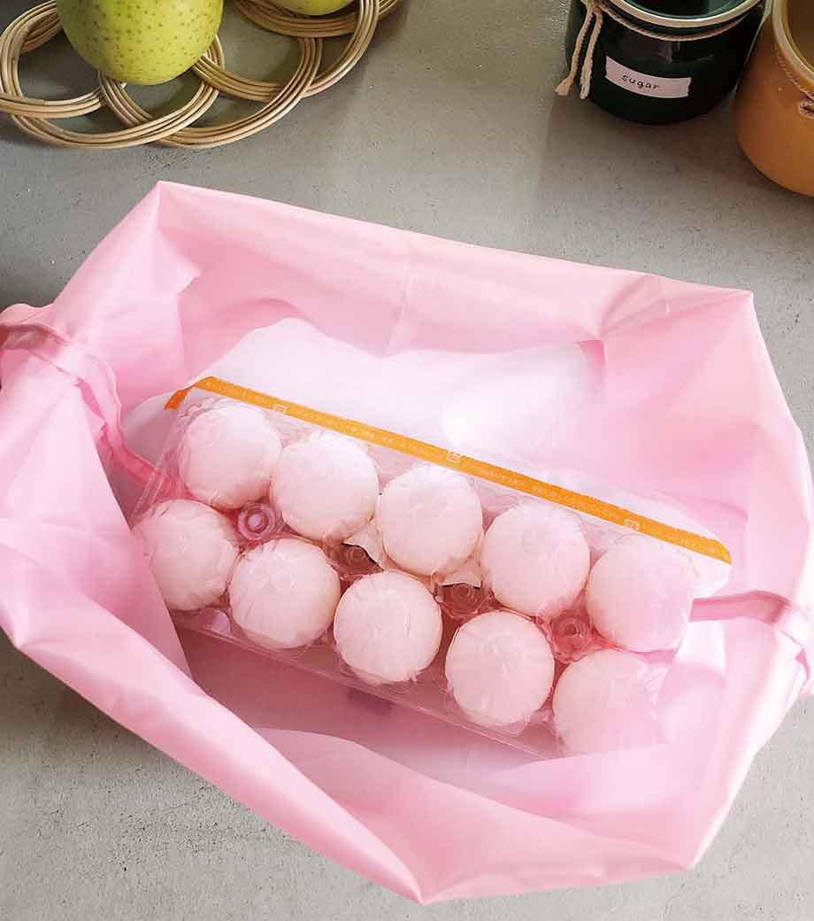 よく使用するレジ袋ぐらいのサイズで2リットルのペットボトルが3本余裕で入る収納力。長めの紐で持ちやすく、お財布とこのバッグだけで近所のお買い物にも便利。くしゅっと丸めてお手玉みたいに可愛く持ち歩けます。