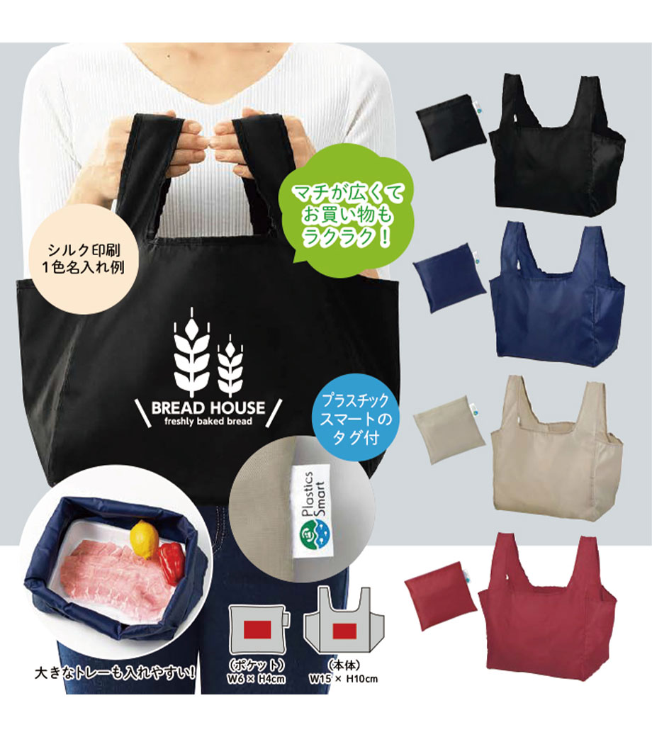 ポケットと本体に1色・フルカラーロゴ印刷ができます。男女問わず使いやすいカラーラインナップが魅力です。レジ袋有料化でエコバッグは必需品。いくつあっても使えるので誰もがもらって嬉しいノベルティですね。