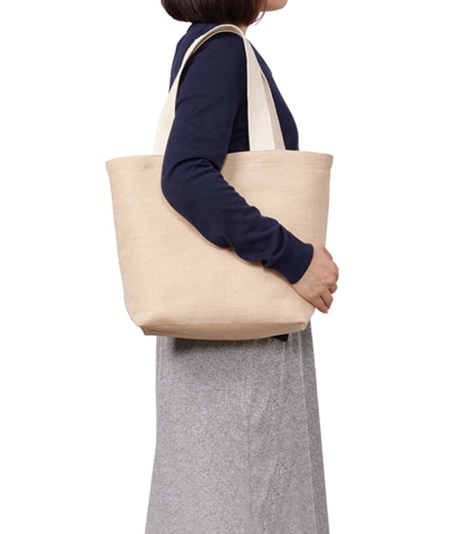ジュートコットントート(L)は、新素材「ジューコ」で作ったマチも有りたっぷりと荷物が入る大容量トートバッグ。通気性に優れ伸びにくく、熱にも強い丈夫なジュート(麻)と、細い糸で織れるので生地の目が細かく、軽くてしなやかなコットン(木綿)のイイトコドリをしたのが「ジューコ」です。