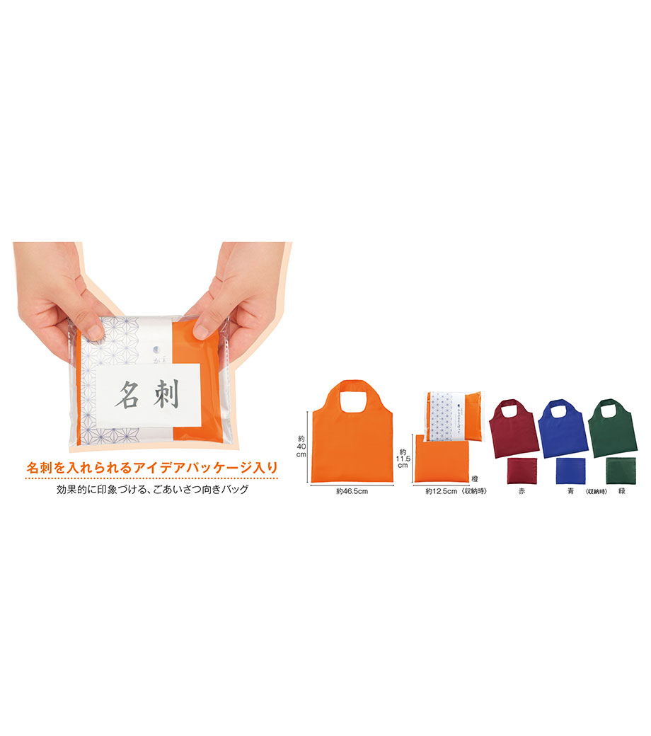 バッグ本体またはフラップ部分に1色・本体にフルカラー名入れ印刷が可能です。バッグ本体は大きく印刷でき、販促効果が期待できます。フラップ部分はワンポイントで印刷でき、折り畳んだ状態でもロゴが見えます。小さく畳んで個包装されているので配布しやすく、メール便でも発送できます。環境問題啓発イベントやキャンペーン、開店記念品や購入特典など幅広いシーンで人気です。