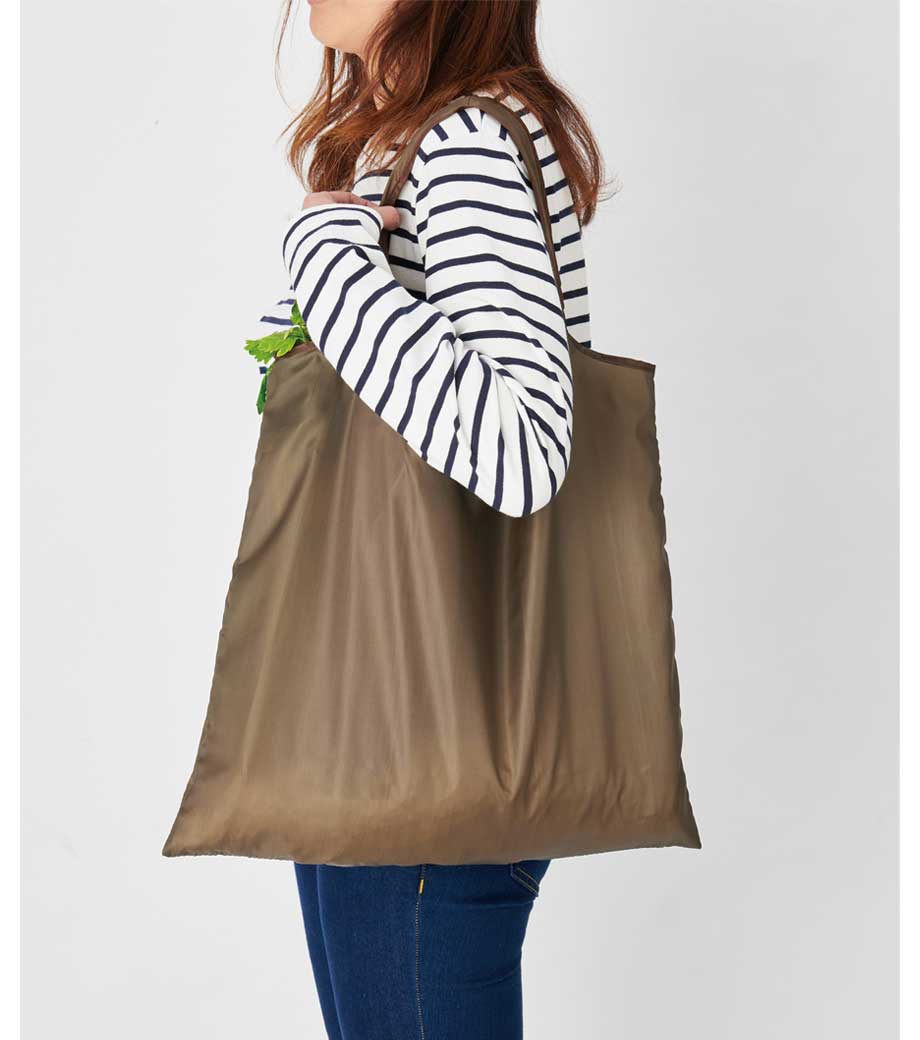 プレント/ポケットインエコバッグは、落ち着いた色味と光沢感のある生地が上品な折りたたみエコバッグ。折りたたんで付属のゴムで留めると、ズボンのポケットにも入るコンパクトさ!肩掛けができる持ち手は、荷物が重くなっても安心ですね。