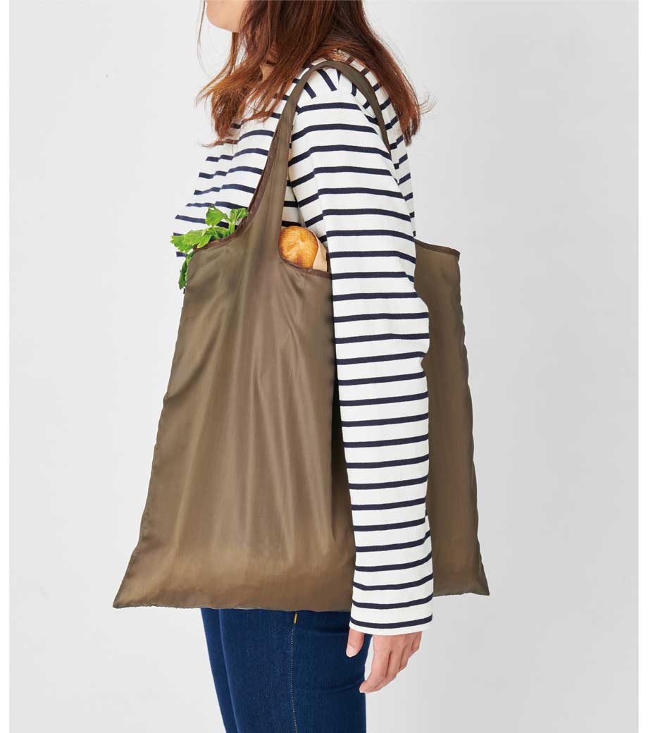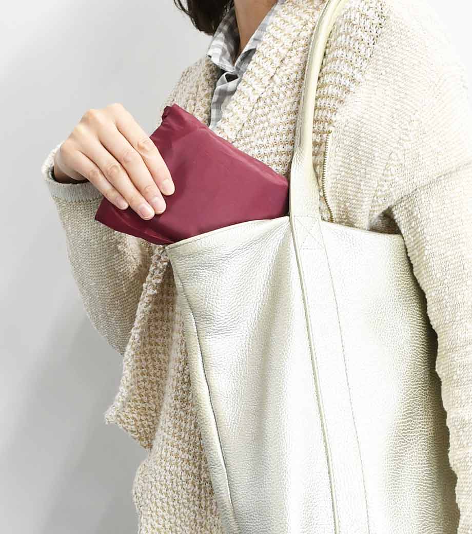 コンパクトに折りたたんで携帯できるので急に荷物が増えたときも安心。しっとりなめらかな触り心地の生地は、シワが戻りやすいこだわりの素材を使用しています。