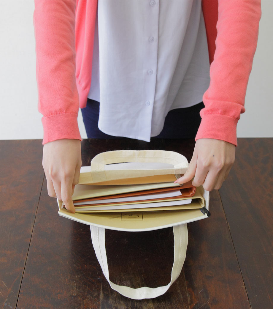 毎日の生活シーンで出番が多いのは、コットンバッグ(M)のようなシンプルで軽いトートバッグ。たたんでメインバッグの中に入れておけば、外出先で荷物が増えたときも大丈夫。活用度の高いアイテムです。