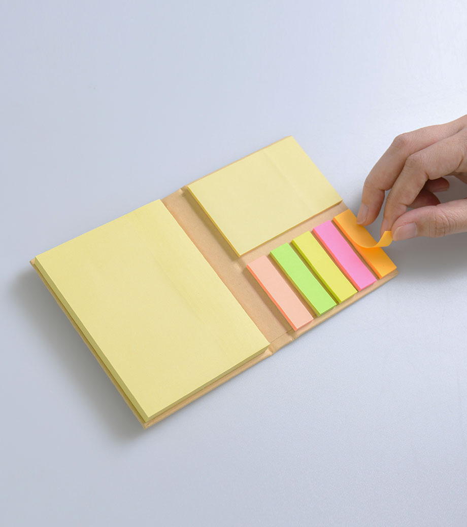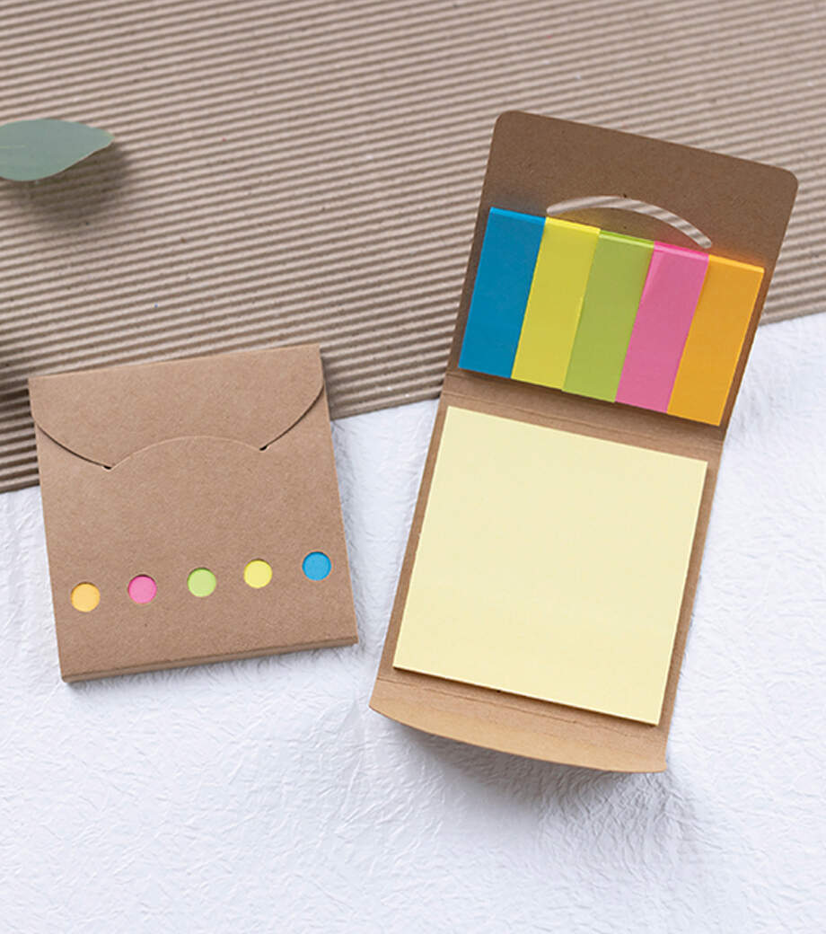 エコ・クラフト付箋メモは、定番のふせんセットに、閉じた状態のときに開かないようにストッパーがついたノベルティです。