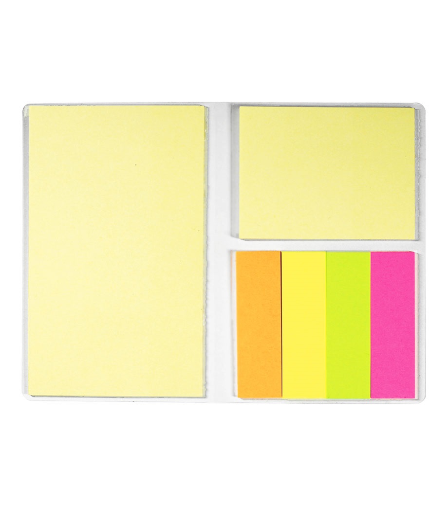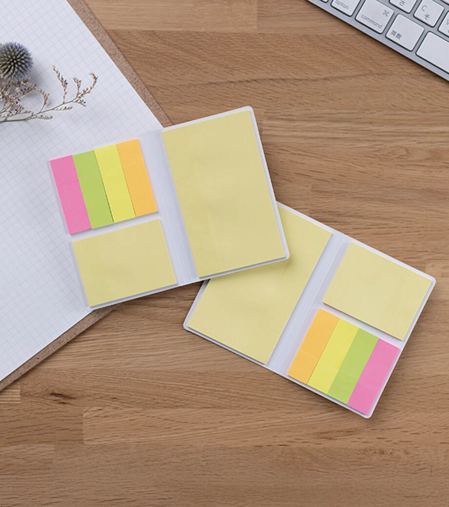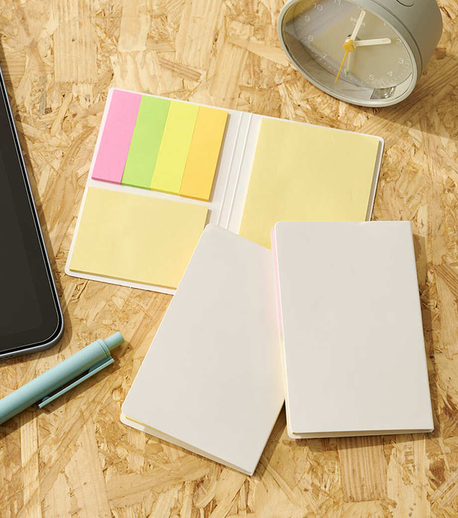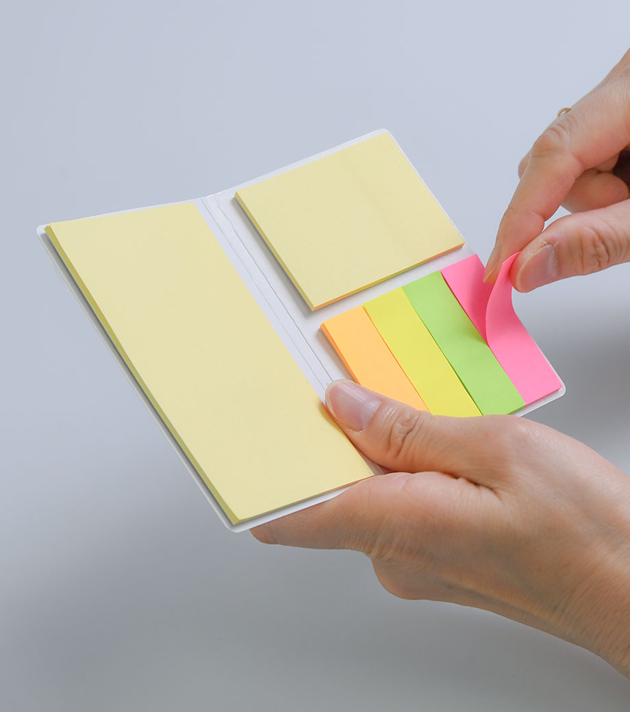 ブック型付箋メモは、大中小3サイズ・6色の付箋入りセット。デスクに携帯しておけば、メモや用件を書きこんで書類にどんどん貼っていけます。