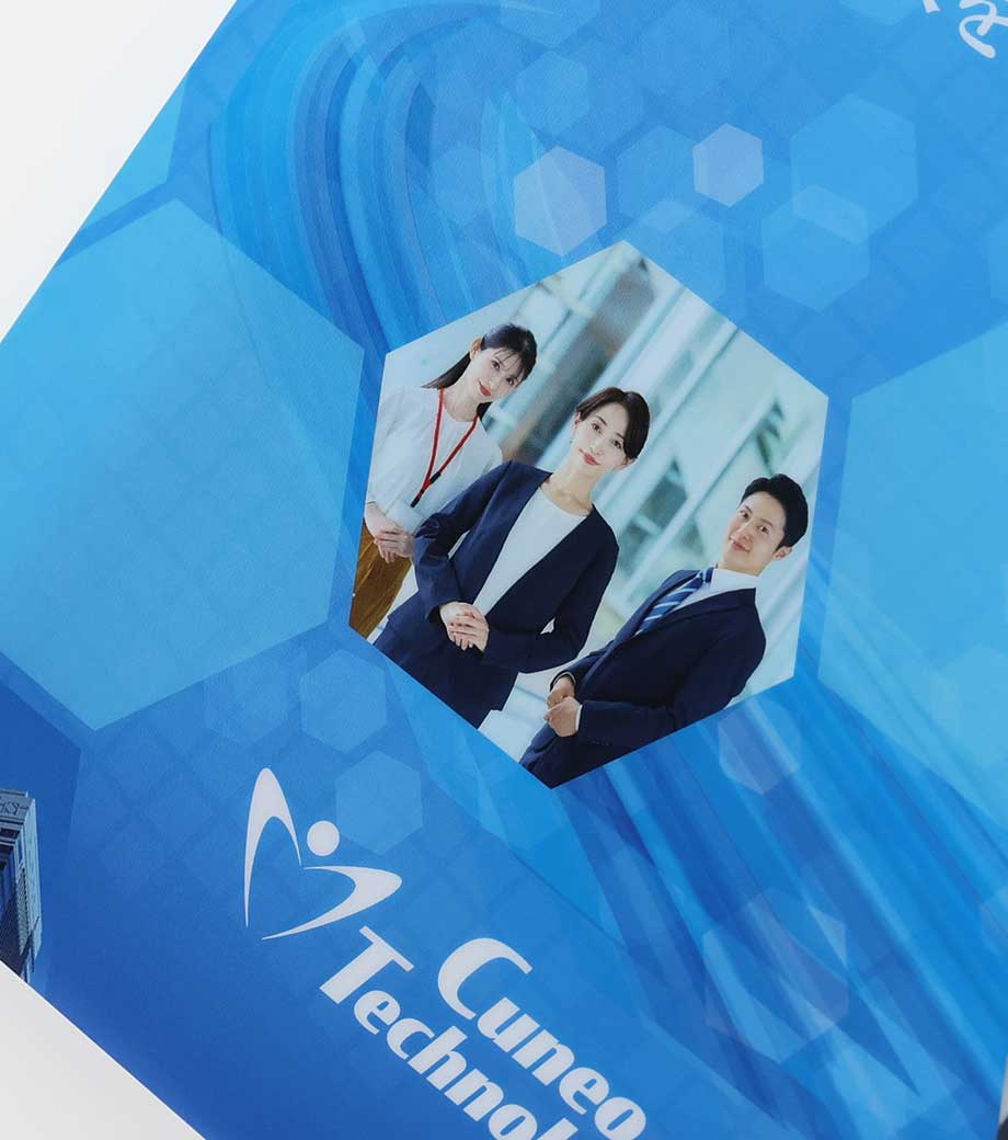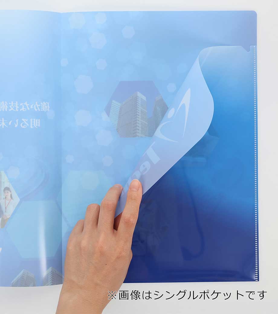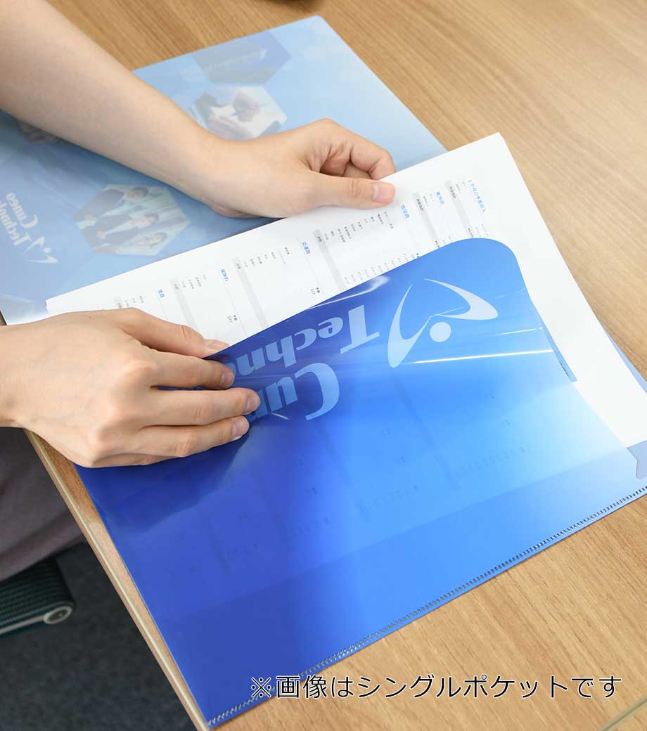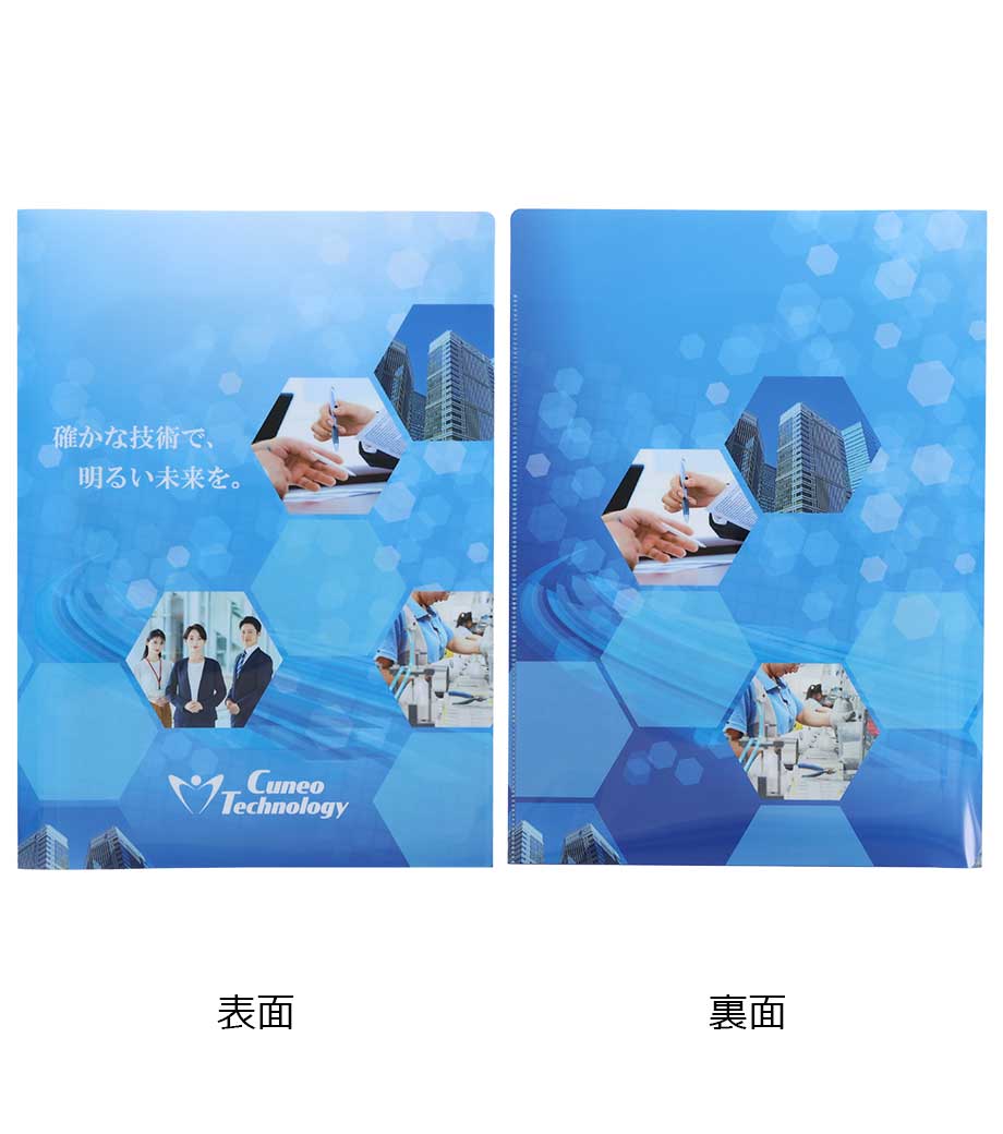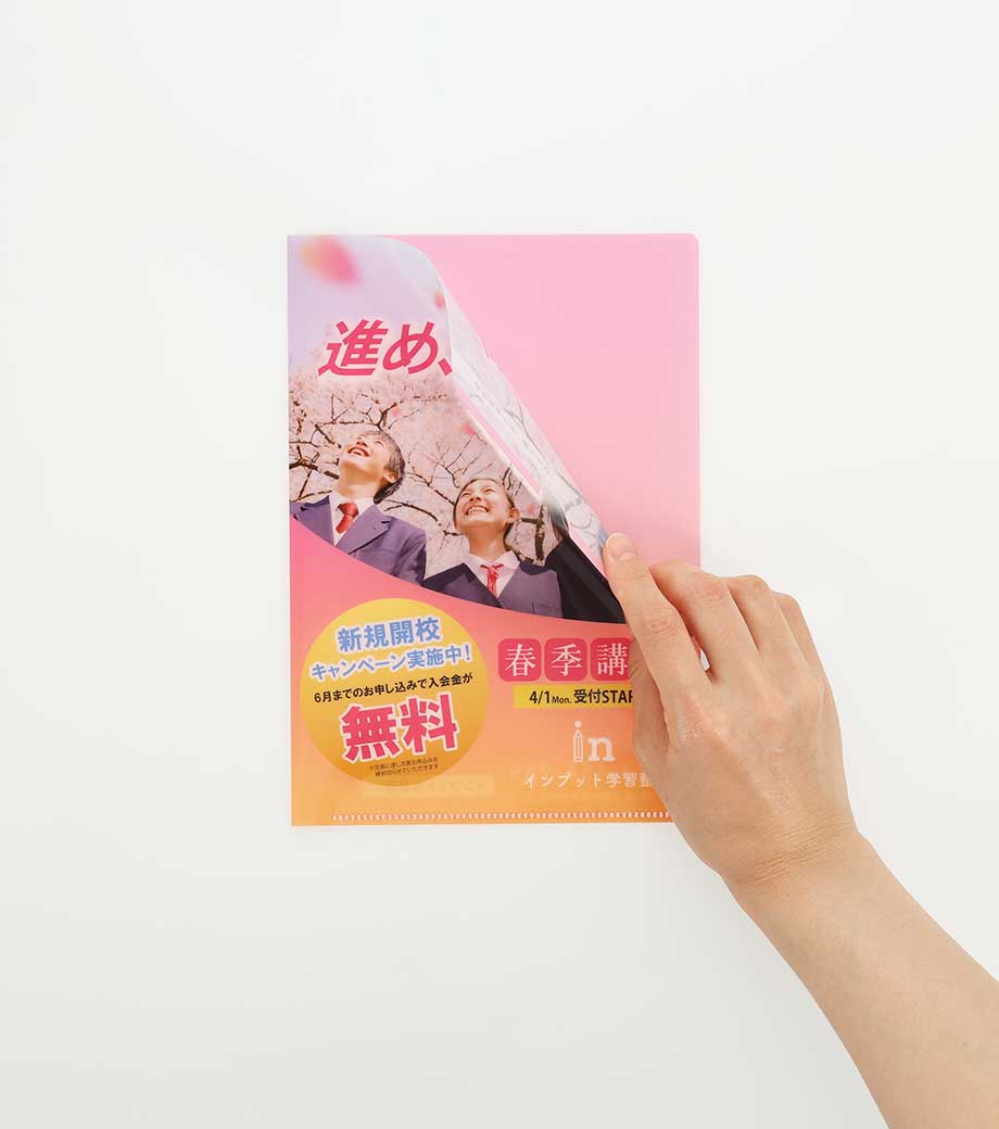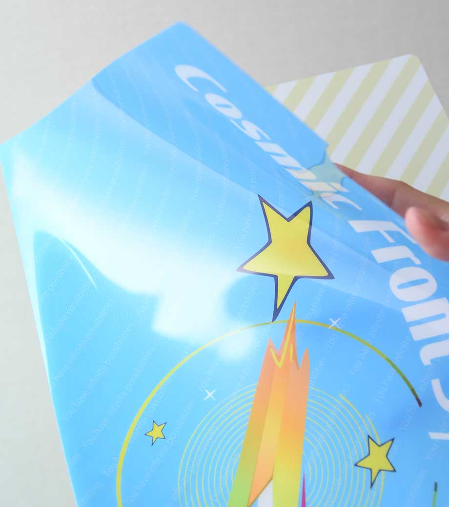 オモテとウラの全面にフルカラー印刷が可能なクリアファイル。細かなデータや写真がきれいに表現できるので、デザインにこだわったオリジナルのノベルティを作成していただけます。