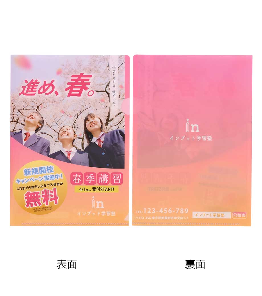 かさばらず実用的なクリアファイルは展示会で人気の販促品。定番のA4サイズはオフィス・学校・自宅、幅広いシーンで活躍するので、長い宣伝効果が期待できます。学校説明会の配布用資料入れとしても人気があり、集合写真を印刷すれば思い出に残る卒業記念品になります。