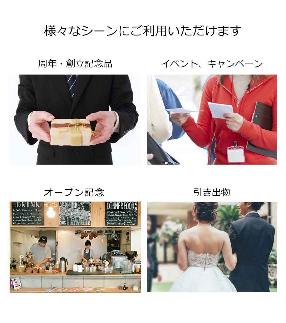 シンプルなデザインで名入れが映えるので、企業名やブランドロゴを印刷すれば宣伝効果が高まります。ショップの購入特典や、イベントのオリジナルグッズにいかがでしょうか。