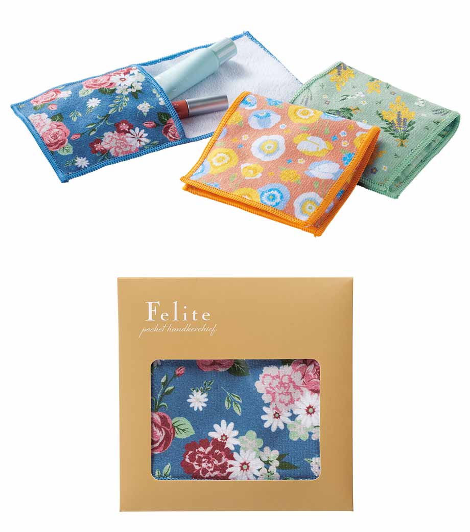 裏面に小物をしまえる便利な収納ポケットが付いたハンカチタオルです。サニタリーグッズやリップなど、持ち歩きたいアイテムをさりげなく収納可能。上品な花模様デザインの3柄アソートでお届けします。窓付きのシックな紙ケース入りで、そのままギフトや女性向けイベントの配布用としても喜ばれるアイテムです。
