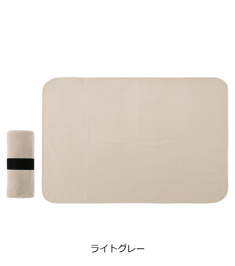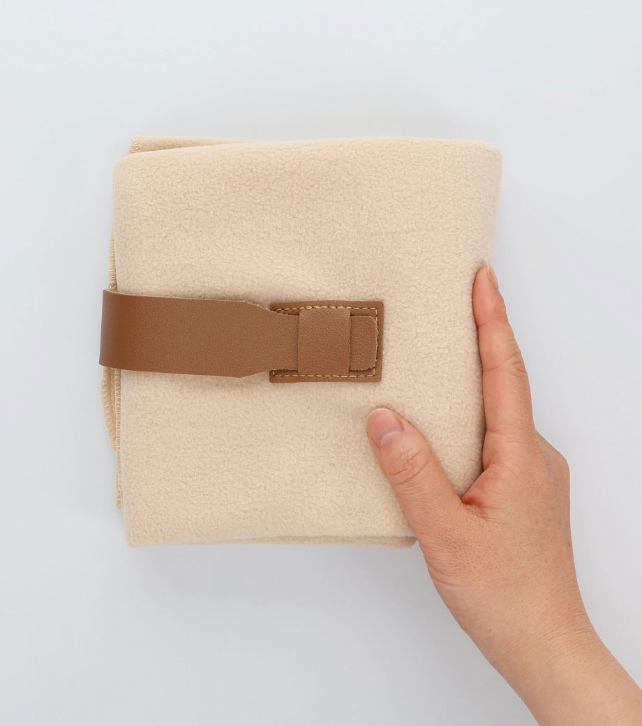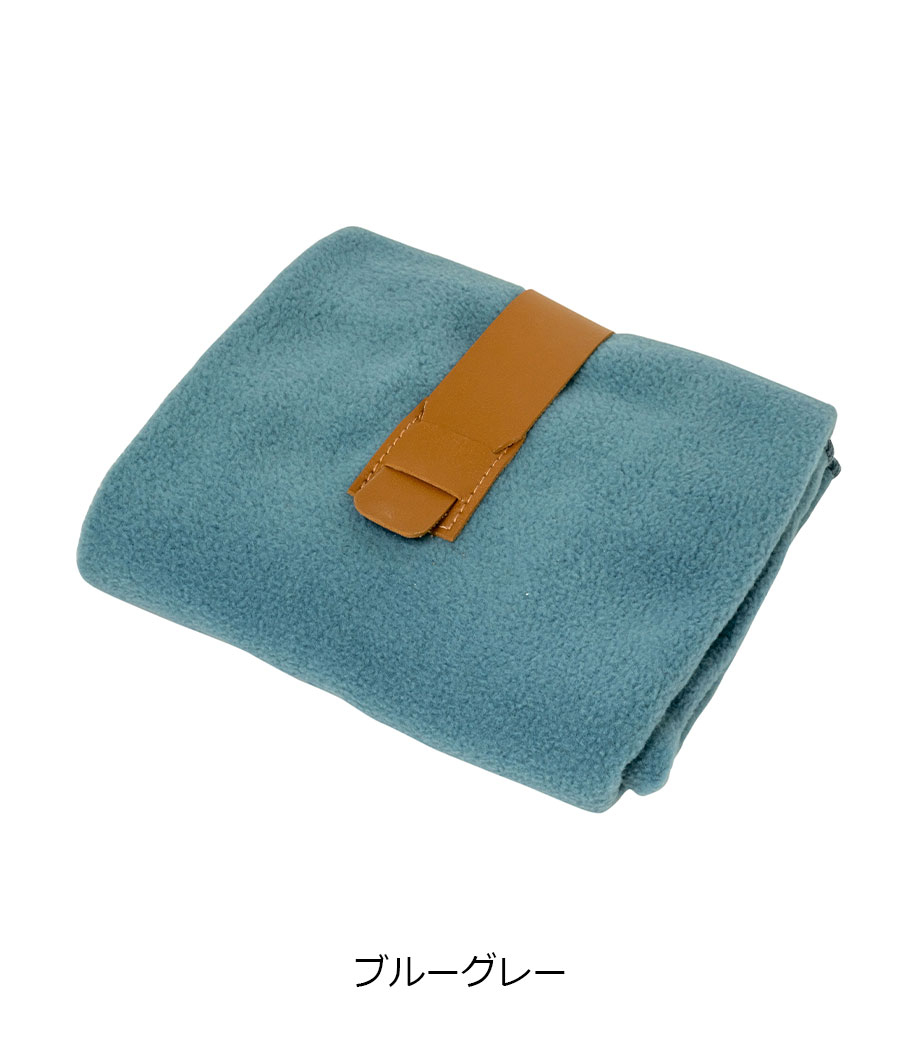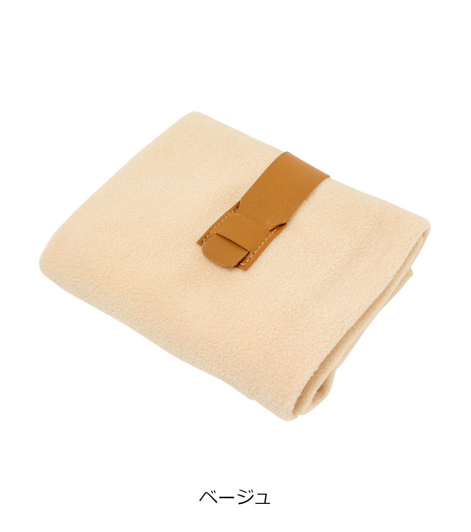 ひざ掛けにちょうどいいサイズのブランケット。面ファスナーで留められるベルト付きで、持ち歩き時はコンパクトにまとめられます。オフィスや車内の防寒対策にいかがでしょうか。定番のシンプルデザインで、男女問わずお使いいただけます。
