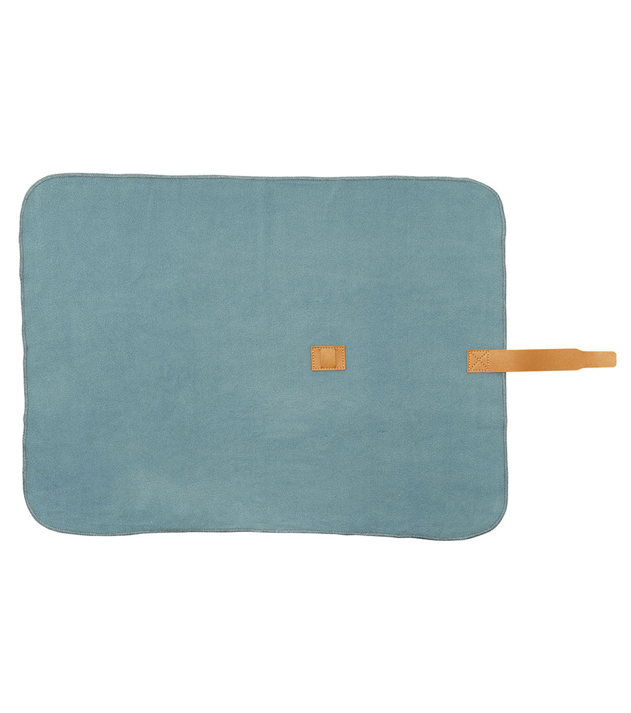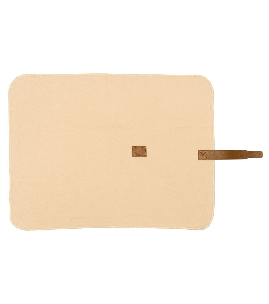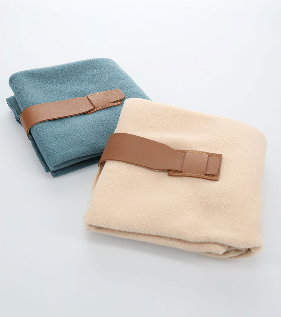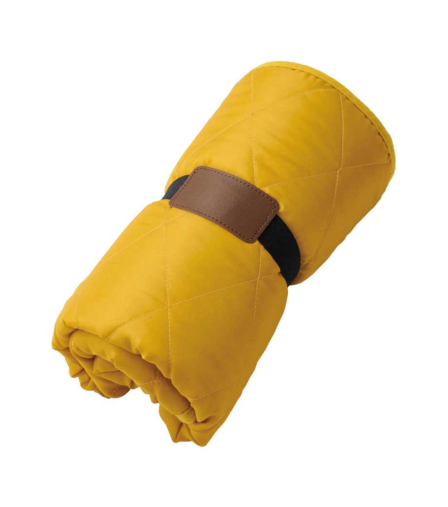 ひざ掛けにちょうどいいサイズのブランケット。面ファスナーで留められるベルト付きで、持ち歩き時はコンパクトにまとめられます。オフィスや車内の防寒対策にいかがでしょうか。定番のシンプルデザインで、男女問わずお使いいただけます。