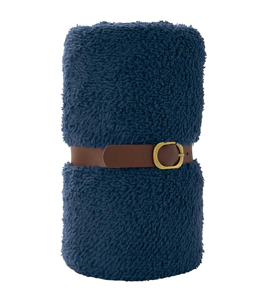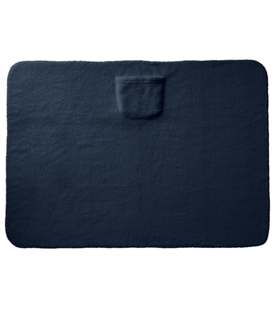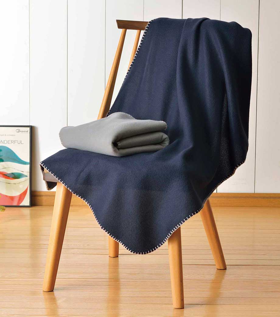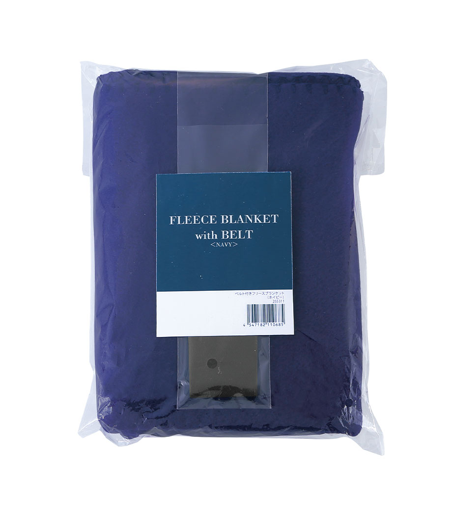 ひざ掛けにちょうどいいサイズのブランケット。ベルト付きで、持ち歩き時はコンパクトにまとめられます。定番のシンプルデザインで、表面はネイビー、裏面はナチュラル。男女問わず使いやすい色使いです。オフィスや車内の防寒対策におすすめです。