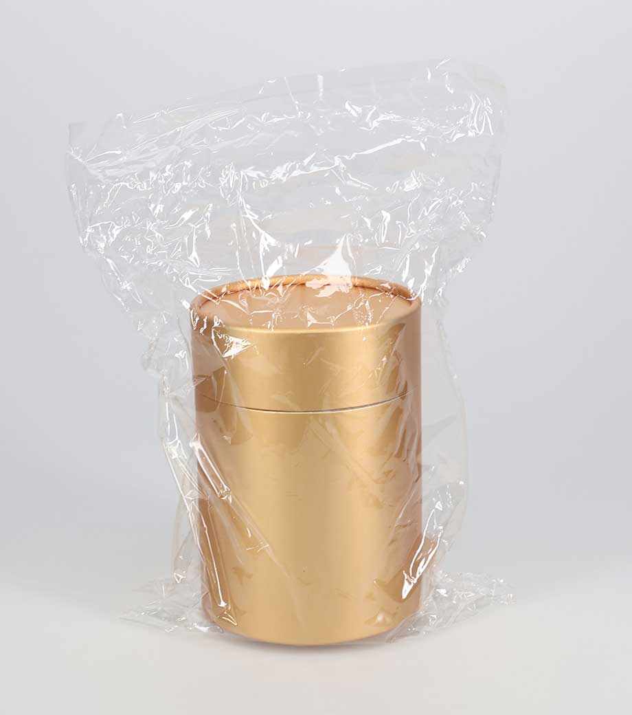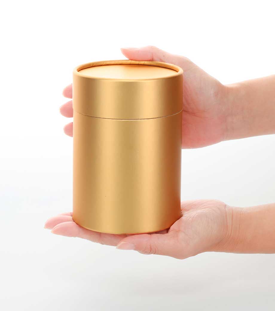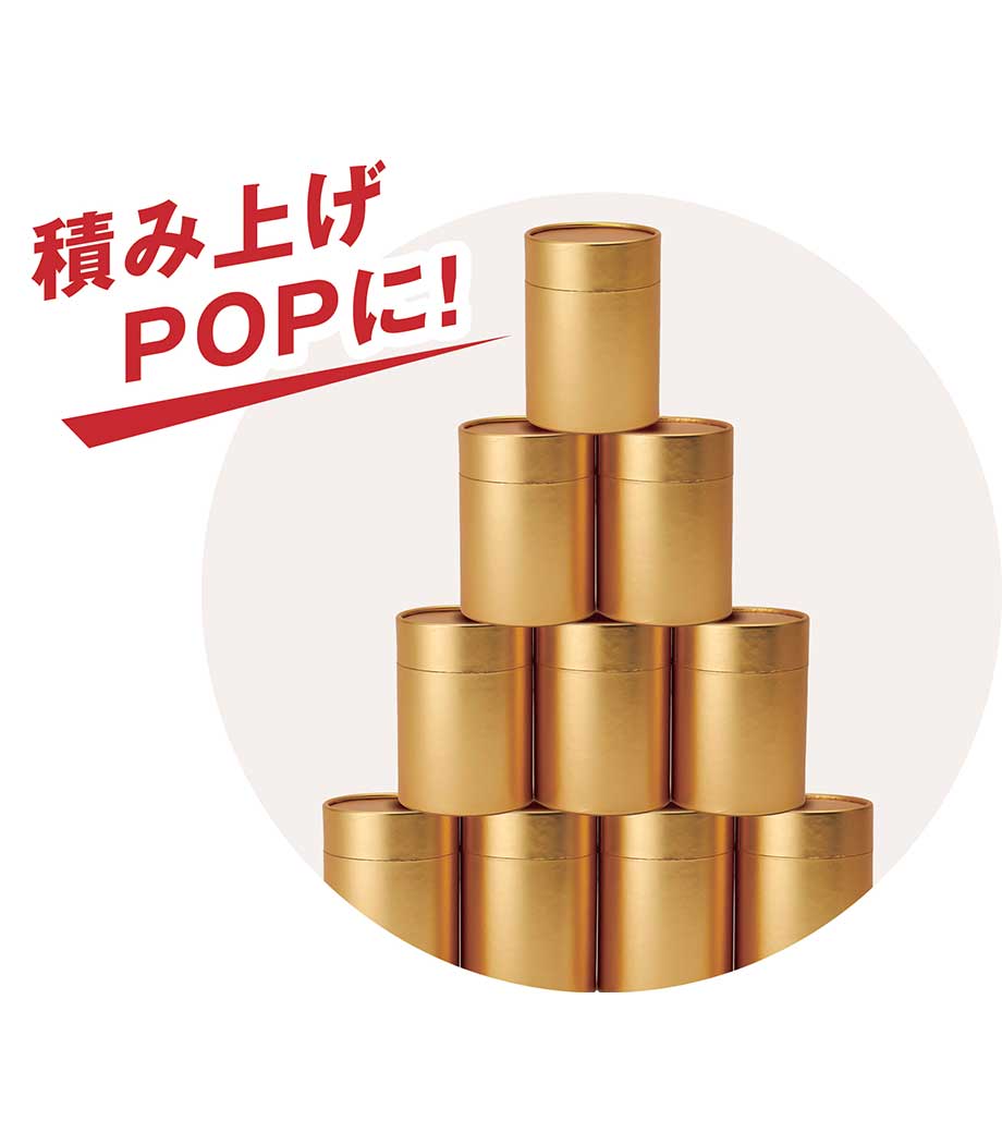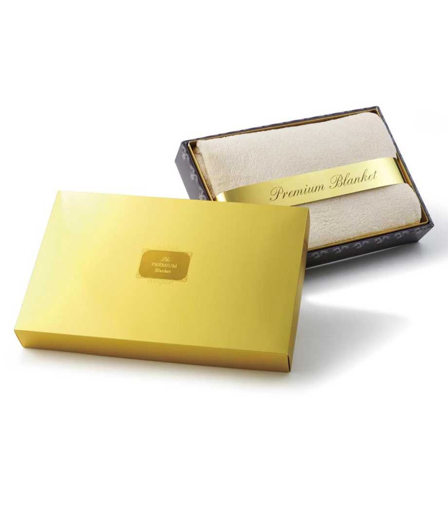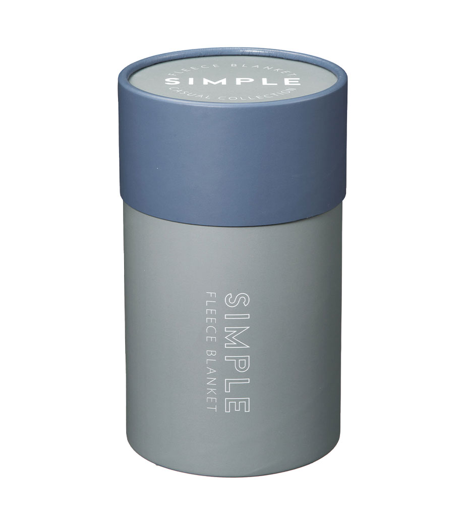 ゴールドの筒型ケース入りブランケット。展示会などでピラミッド型に積み上げれば、POP効果抜群!ブランケットは無地のグレーで誰もが使いやすい定番型です。ひざ掛けサイズでオフィスや自宅での防寒対策に。