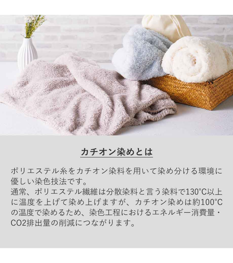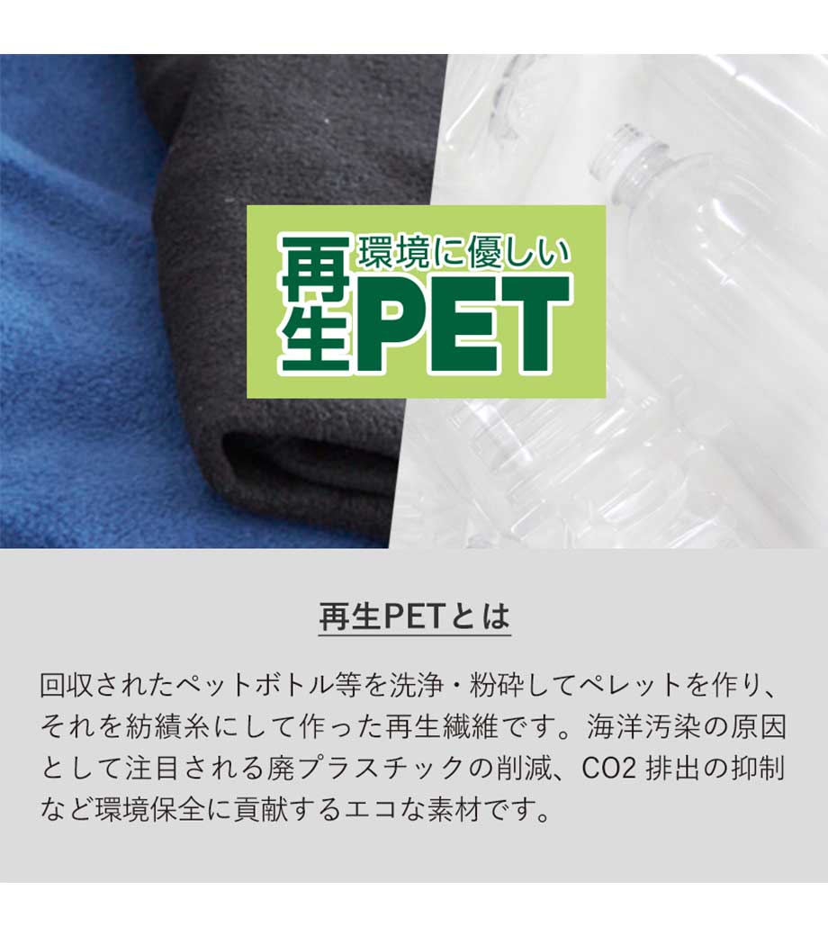 エコブランケット(再生PET) レギュラーはペットボトルなどから作られる再生繊維を使用したブランケット。毛玉防止加工を施しており、肌触りが良くチクチクしません!軽く羽織ったり、ひざ掛けに便利なサイズ感です。寒い時期はもちろん、夏の冷房対策にも。ブランケットを使えば電力の省エネにもなり、SDGsへの取り組みにもつながります。