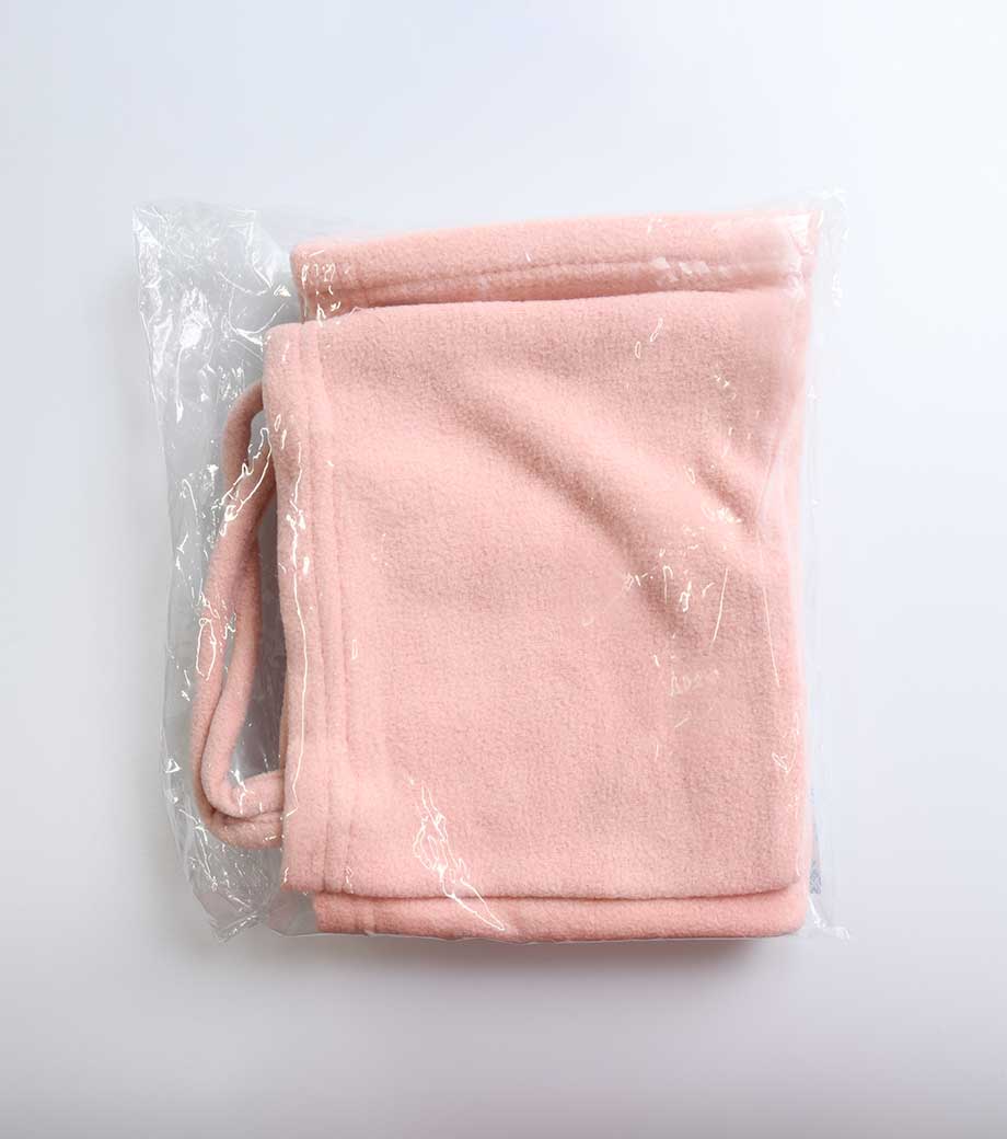 フリースブランケット(巾着付) は、コンパクトに収納して持ち歩きしやすい、名入れができる巾着付のブランケット。
