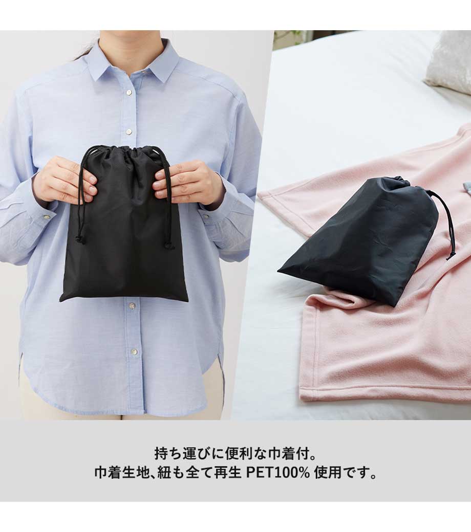 エコブランケット(再生PET)レギュラー 巾着付は、ペットボトル等から作る再生繊維を100%使用しています。肩に軽く羽織れるレギュラーサイズで、持ち運びに便利な巾着入り。オフィスの防寒対策にはもちろん、キャンプやバーベキューなどアウトドアシーンでも活躍します。嬉しい毛玉防止加工付き。