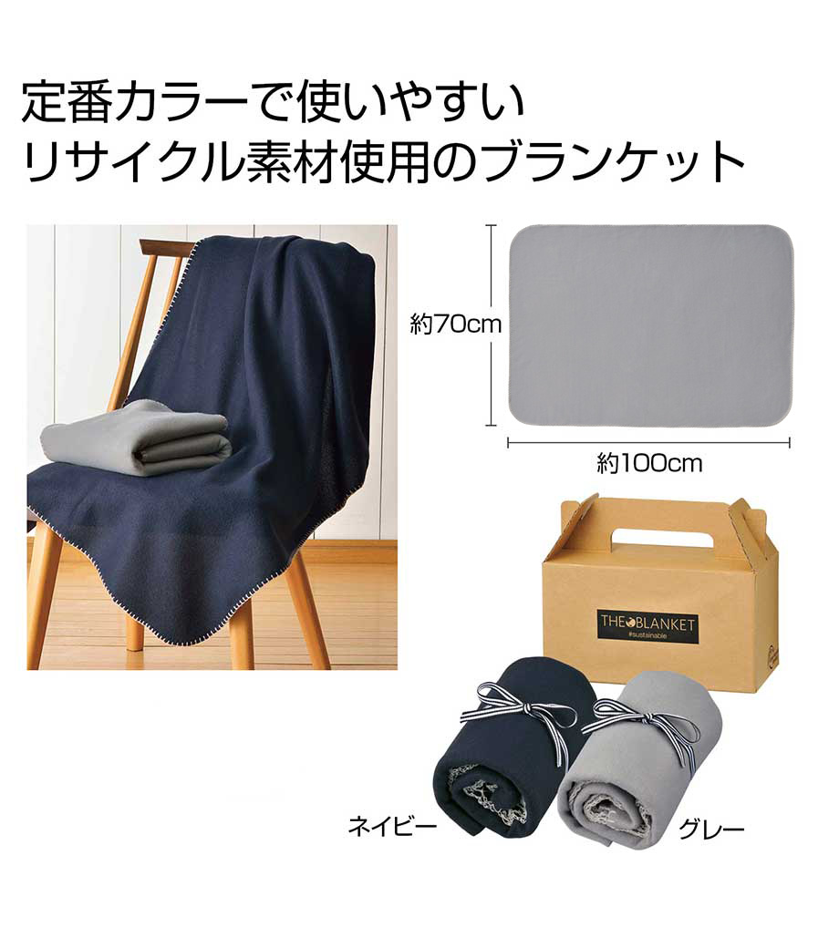 ザ・ブランケット #sustainable 1枚は、「グローバル・リサイクルド・スタンダード(GRS)」という国際的な製品基準に認証された工場のリサイクル生地を使用。SDGsを意識したノベルティをお探しの方にピッタリな、環境に配慮したブランケットです。
