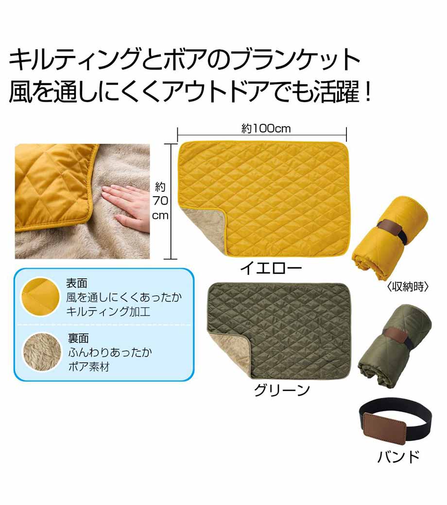 キルトフリースブランケット(巾着付)は、表はキルティング、裏はフリース素材に中綿が入った三層構造。ダウンジャケットのように暖かく、風を通しにくい極上ブランケットです。