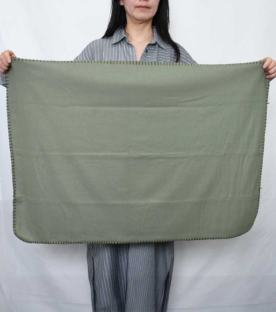 カチオン染めレギュラーブランケット(巾着付)は、環境にやさしいカチオン染料を使用したブランケットです。生地に表情があり、やさしい色味が特徴のカチオン染め。ふんわりとした起毛が抱きしめたくなる心地良さで眠くなりそうです。肌寒い時の肩掛けやひざ掛けに使い勝手の良いサイズ感。少し太めの糸で施されたブランケットステッチもおしゃれです。片ひもタイプのシンプルなコットン巾着がセットになっているので持ち運びにも便利です。