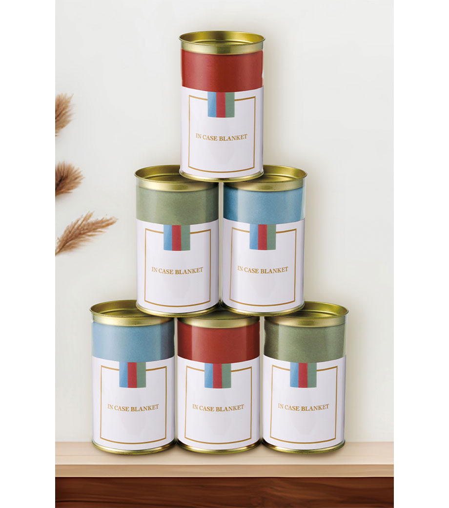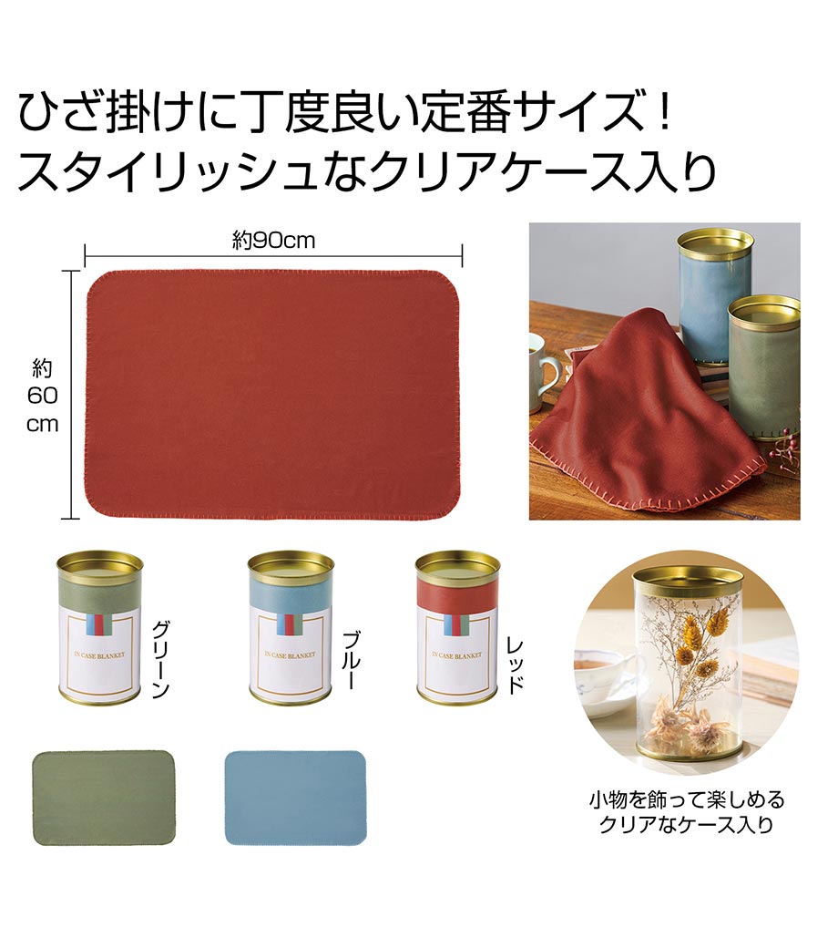 スタイリッシュなゴールドの蓋が印象的な円筒形のクリアケースに、ニュアンスカラーのグリーン・ブルー・レッドのブランケットを入れました。ひざ掛けにちょうどいいサイズ感。オフィスや車内での寒さ対策に役立ちます。カーショップの来場者プレゼントやキャンペーンのノベルティにおすすめ!1色印刷でオリジナルブランケットも作れます。