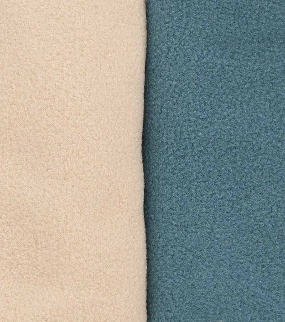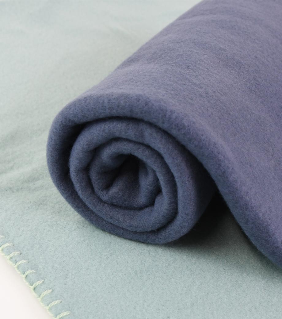 厚手スムースフリースミニブランケットは、表面はスウェットのようななめらかなスムース生地で、体に当たる裏面は暖かいファーのダブルフェイス生地になっています。
