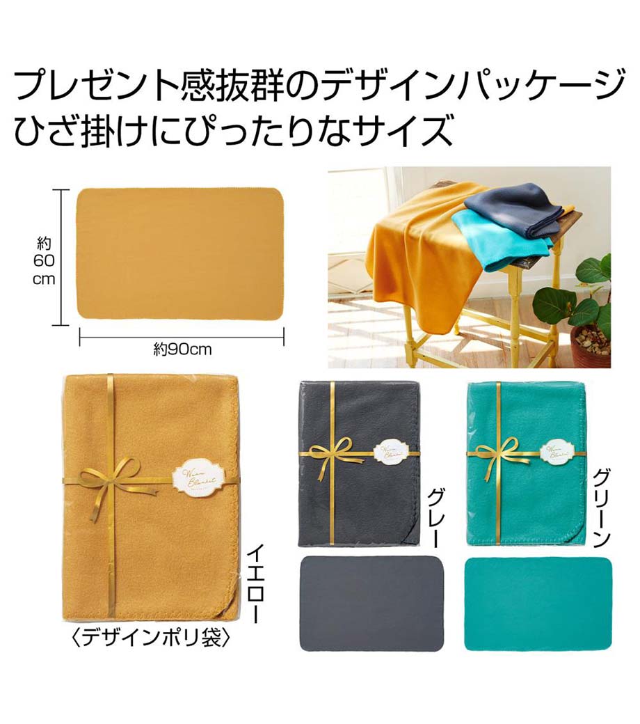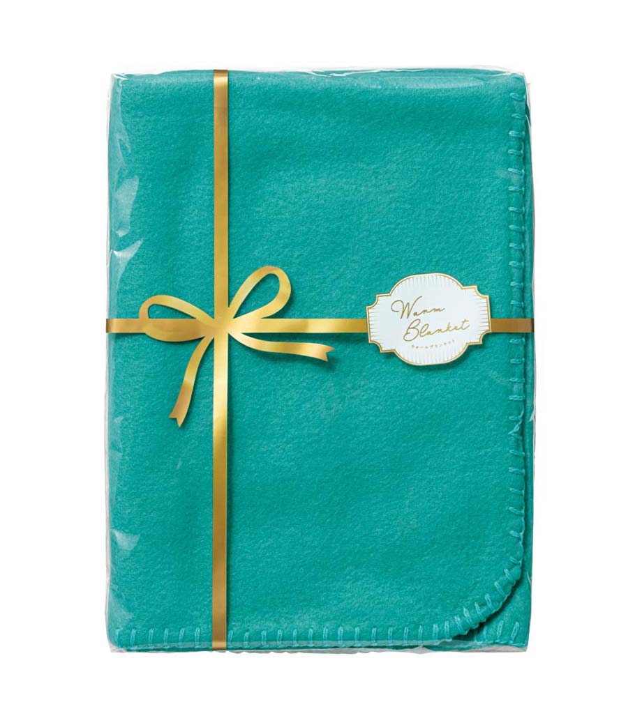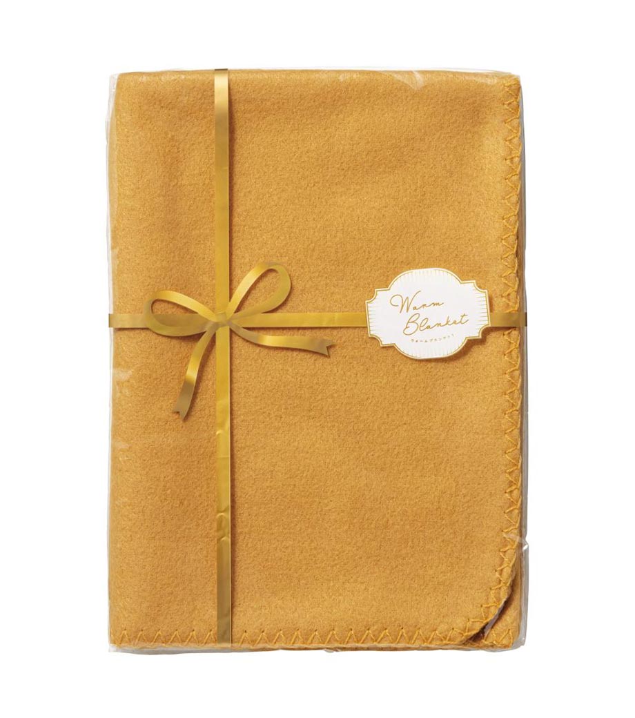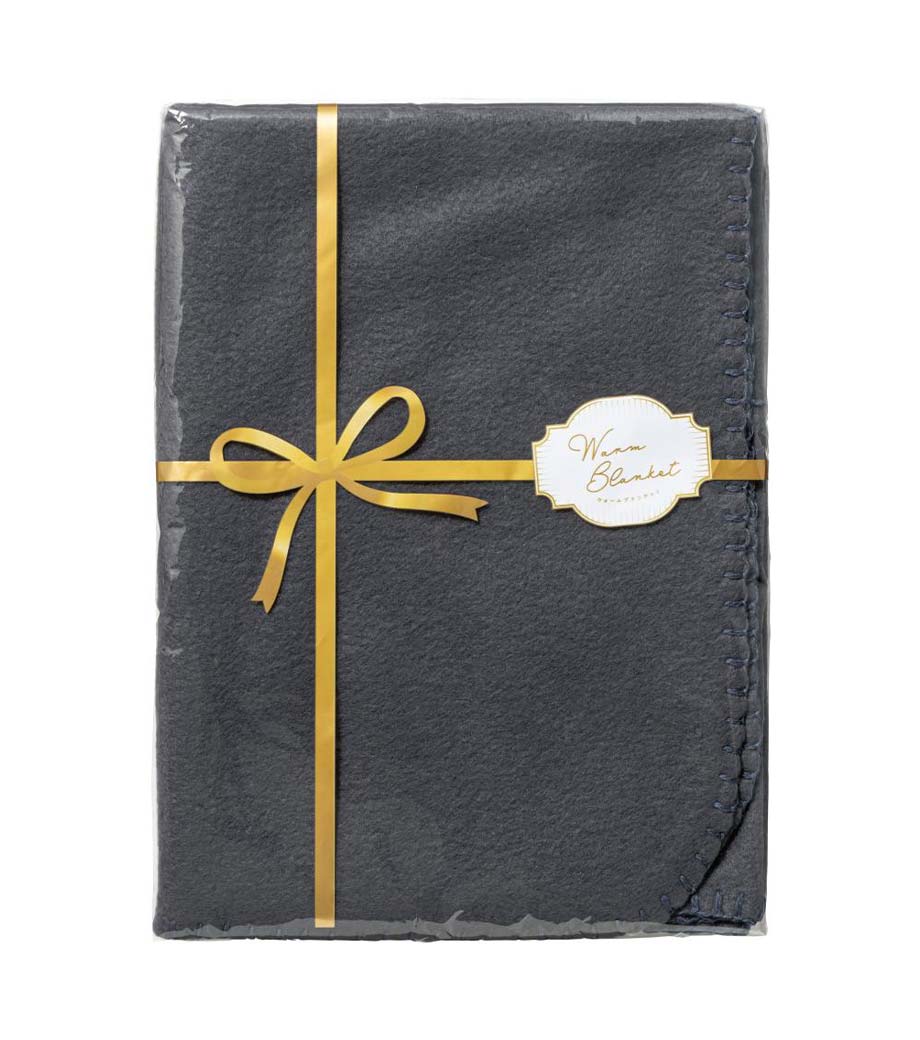 リボンで包まれたプレゼント風パッケージが目を引くウォームブランケットです。