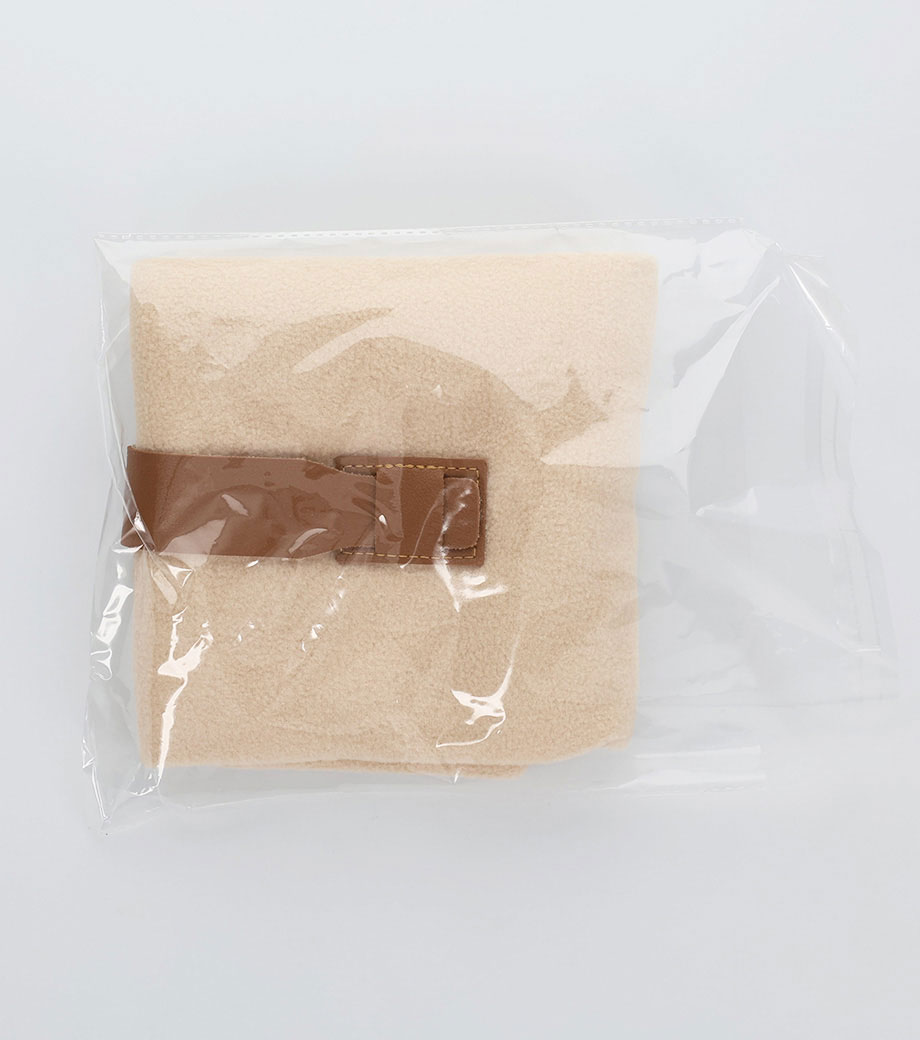 4つの動物のパッケージがかわいいブランケットです。ブラウン(ネコ)・ブルー(フクロウ)・イエロー(キツネ)・レッド(イヌ)の4色取混ぜでお届け。どれにしようか選ぶ楽しさがあるノベルティです。小判抜きの持ち手つきのパッケージで、そのままお持ち帰りできます。