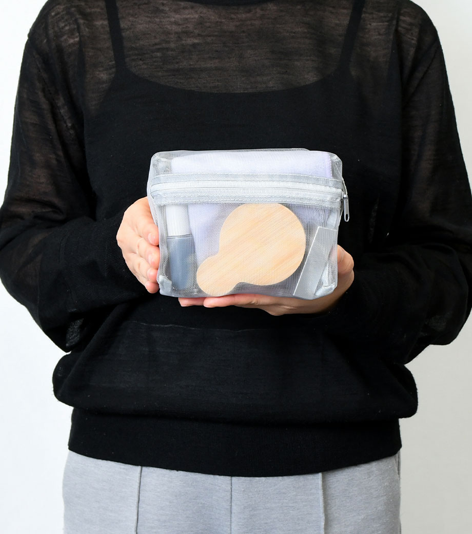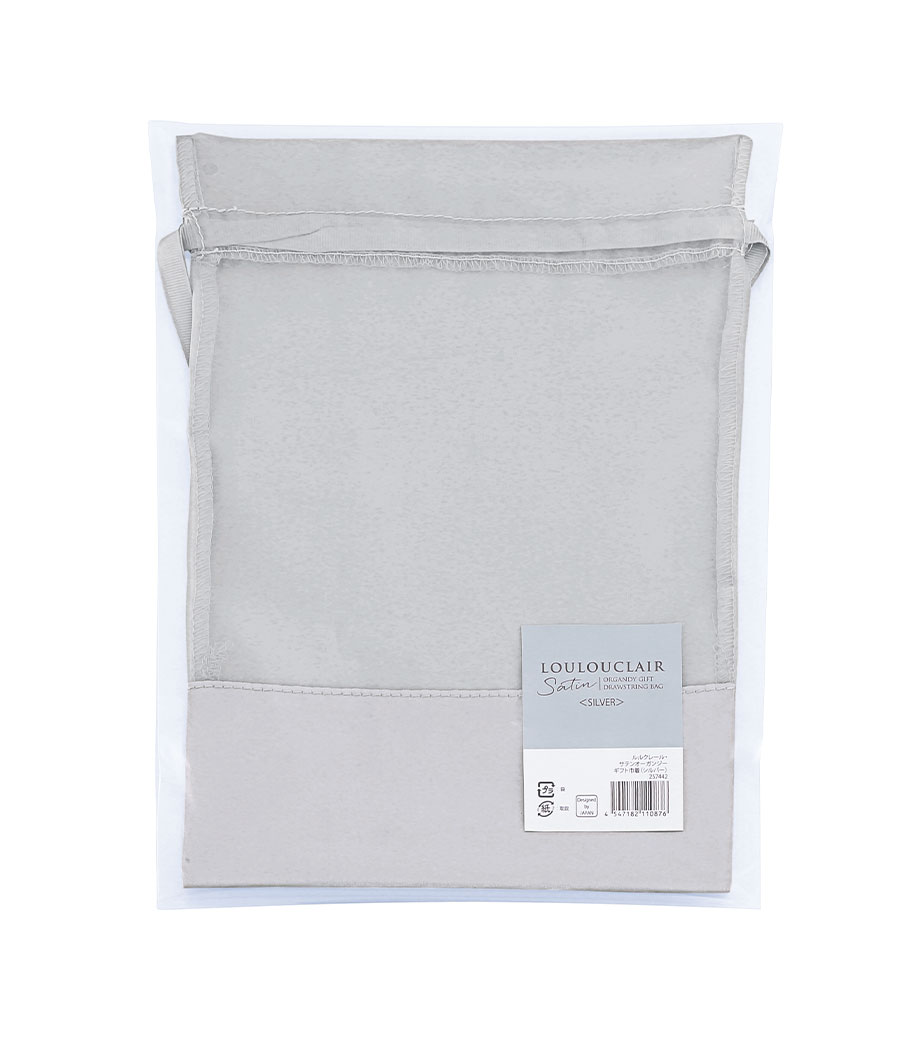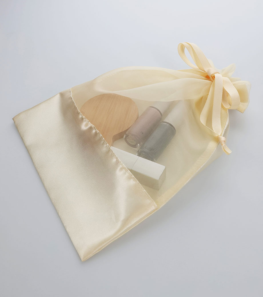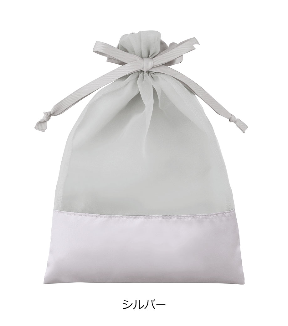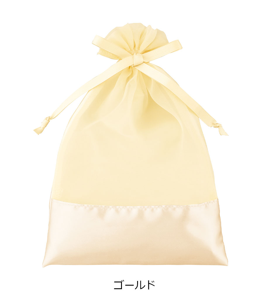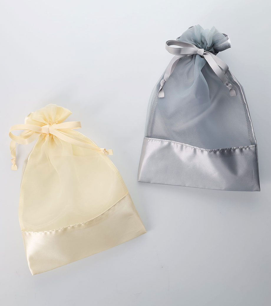 サテンの艶とオーガンジーの透け感が美しく調和したエレガントな巾着。落ち着いたトーンのカラーリングが上品な印象です。巾着自体はA4相当の大きさで、A5以内のアイテムがすっきり収まるサイズ感。コスメやスキンケアアイテムのギフト包装、ノベルティセットのパッケージにぴったりです。