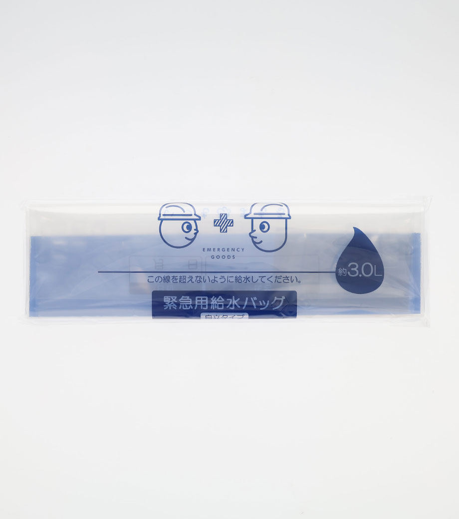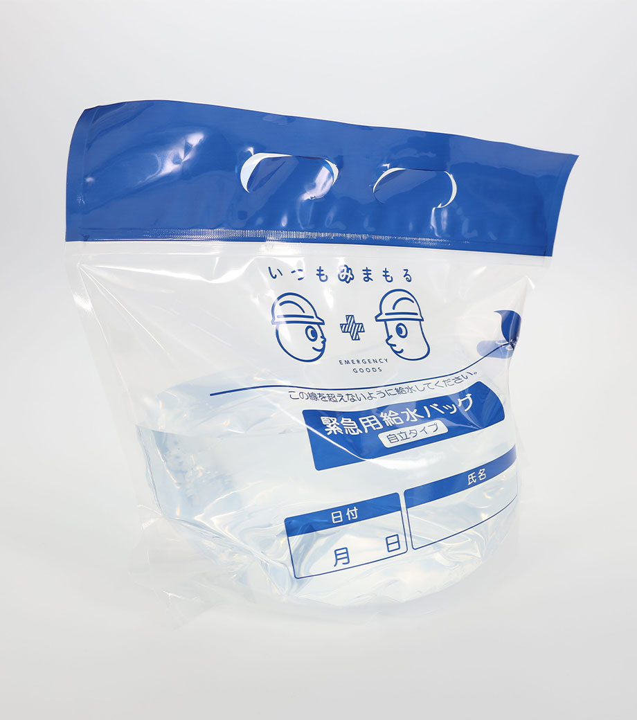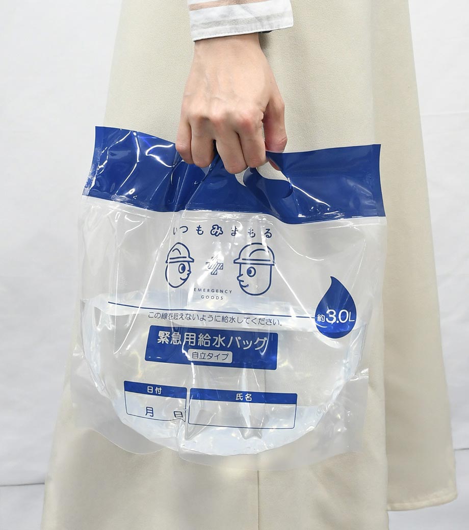 非常時に1人1日分の水を確保するのに便利な給水バッグです。持ち手付きで運搬しやすく、自立するので安定して使えます。口元はジッパー仕様になっており、中身がこぼれにくいのも嬉しいポイント。日付や氏名の記入欄付きで、避難所での使用にも便利です。