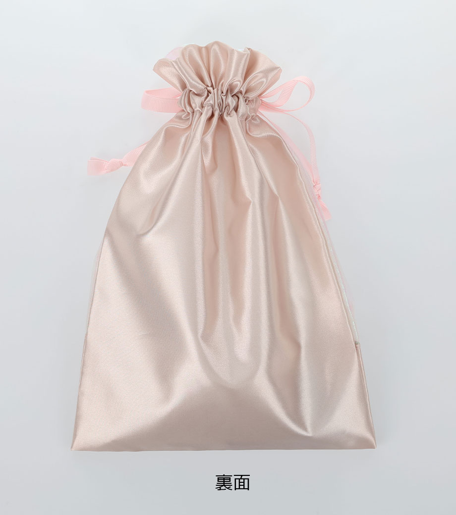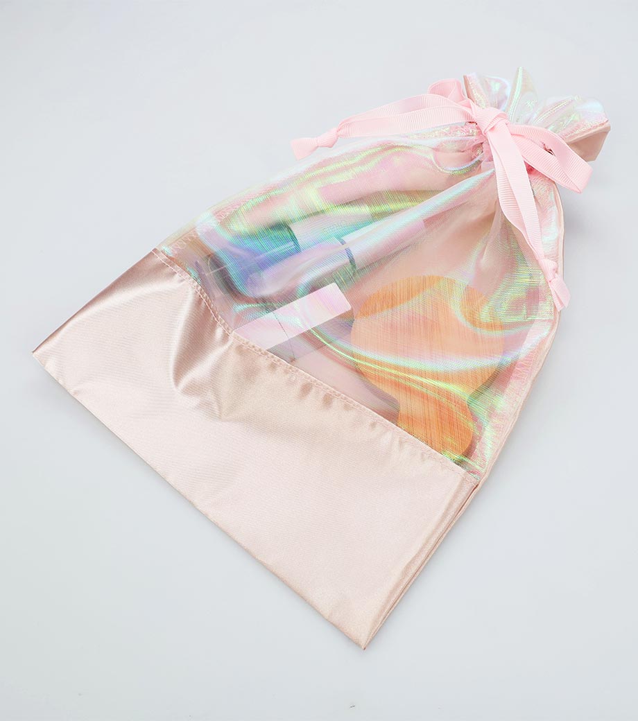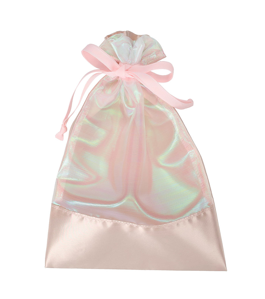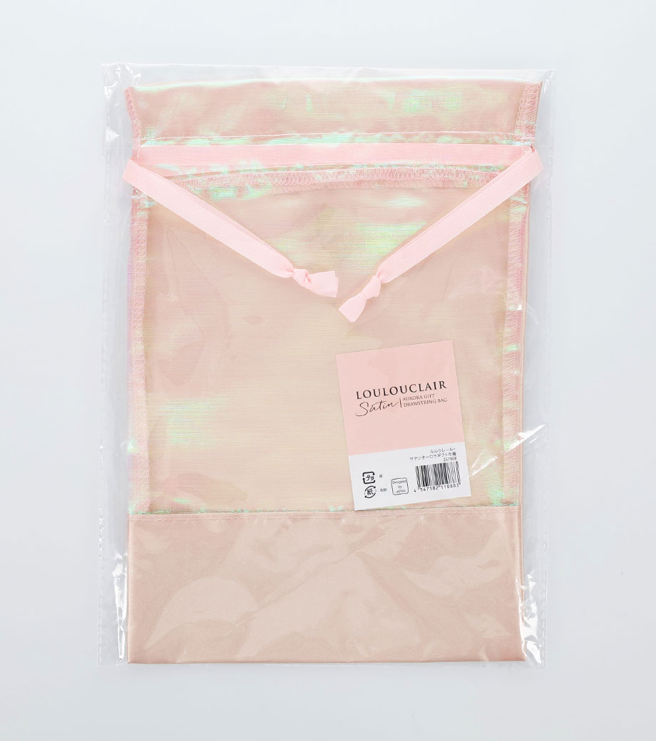 きらめくオーロラのオーガンジー素材を使った可愛らしい巾着。サテン生地との異素材MIXをピンクでまとめており、コスメやサロンなどのノベルティにおすすめです。巾着自体はA4相当の大きさで、A5以内のアイテムがすっきり収まるサイズ感。コスメやスキンケアアイテムのギフト包装、ノベルティセットのパッケージにぴったりです。
