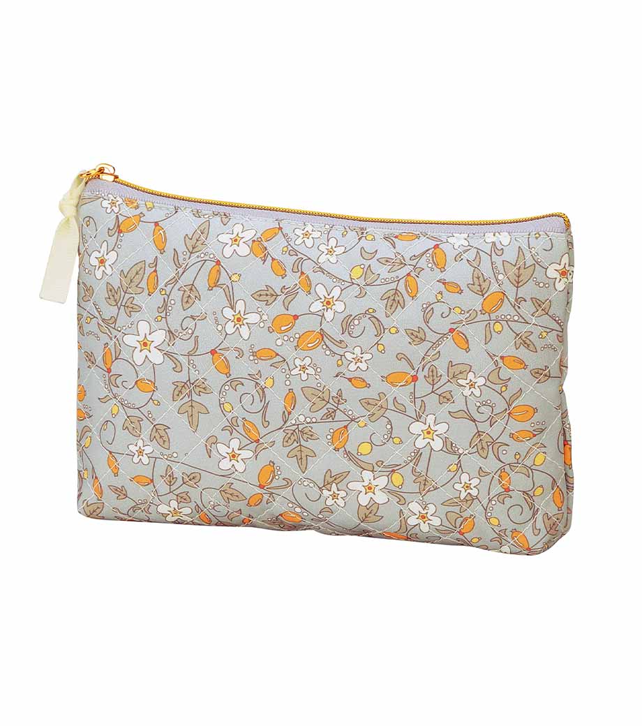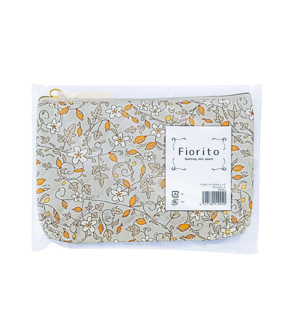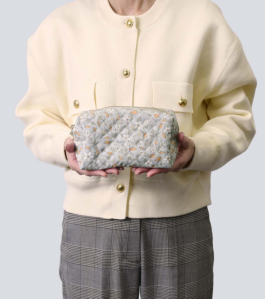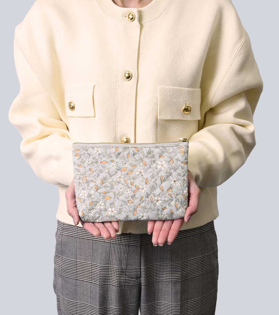 花柄プリントとキルティングの組み合わせが可愛いスリムポーチ。A6サイズのメモ帳が入るサイズ感で、コスメポーチやペンポーチとしてお使いいただけます。底にコンパクトな約20mmのマチ付き。ほぼフラットポーチの形状ながらも、コンパクトなど厚みのあるコスメアイテムも入れられます。