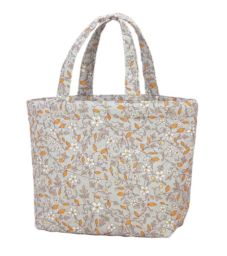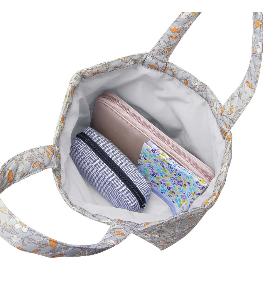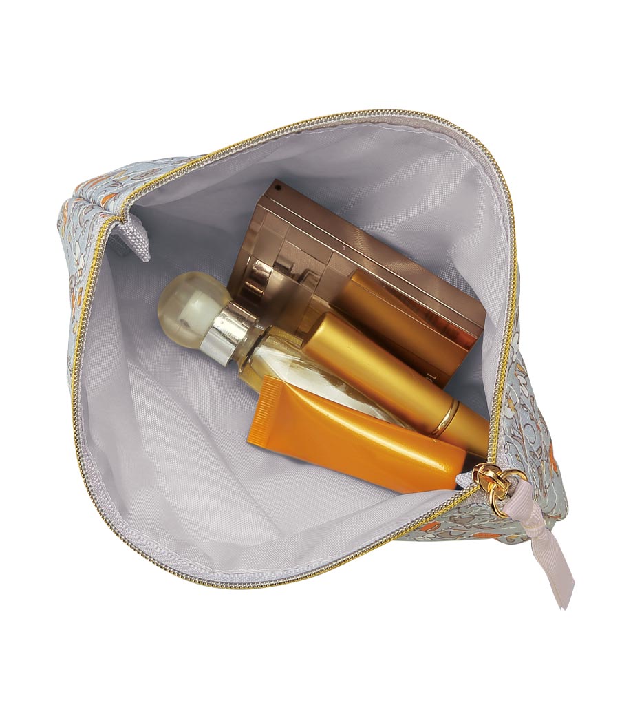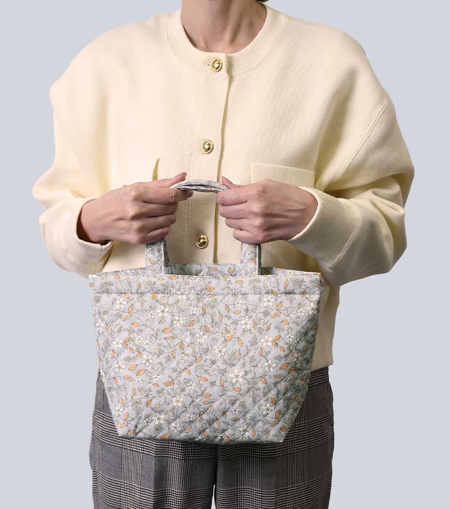花柄プリントとキルティングの組み合わせが可愛いスリムポーチ。A6サイズのメモ帳が入るサイズ感で、コスメポーチやペンポーチとしてお使いいただけます。底にコンパクトな約20mmのマチ付き。ほぼフラットポーチの形状ながらも、コンパクトなど厚みのあるコスメアイテムも入れられます。
