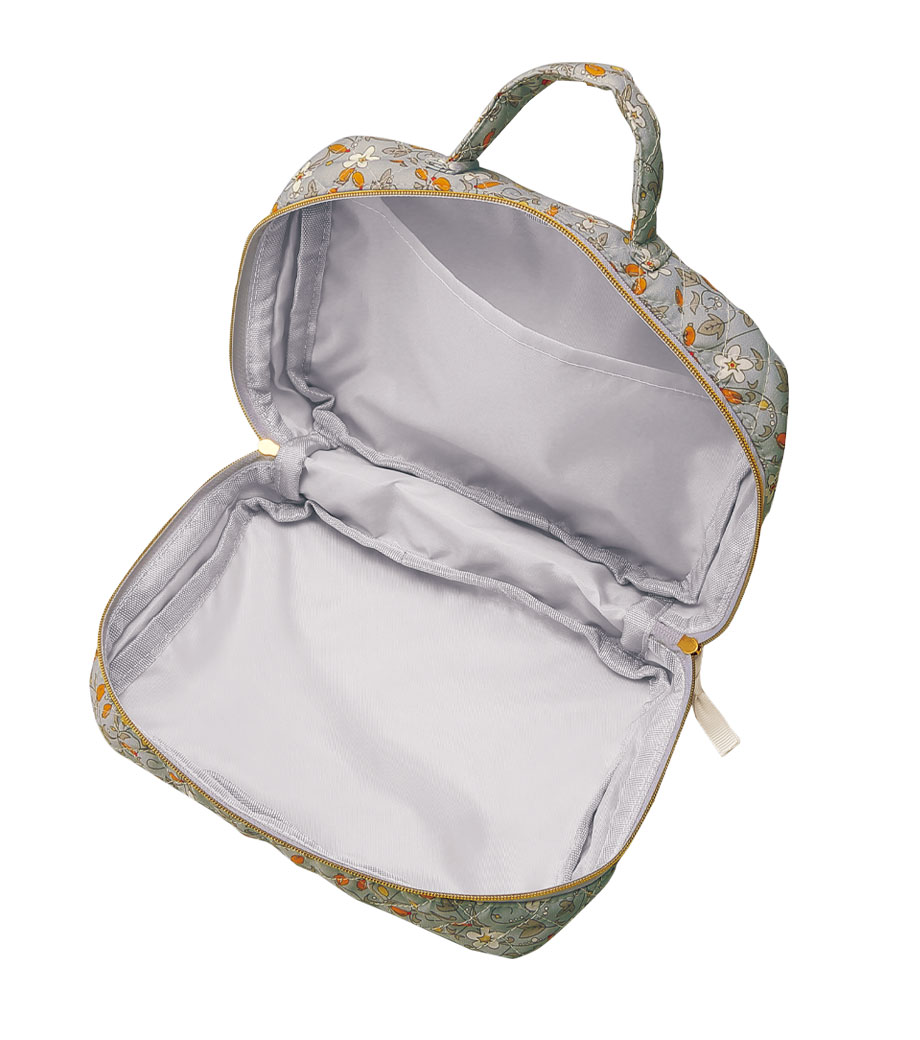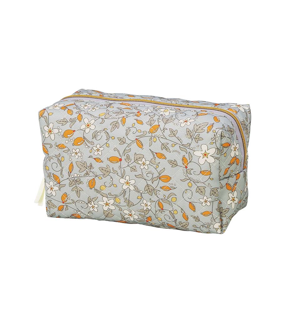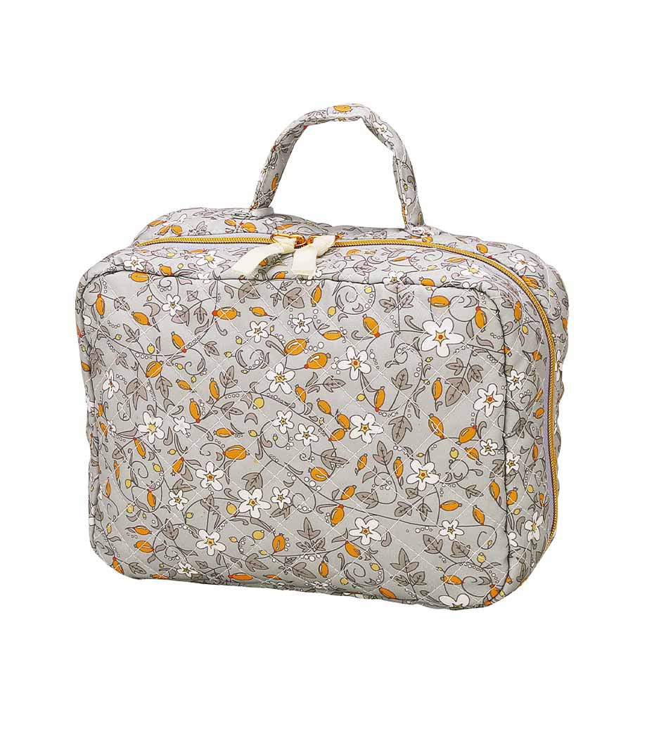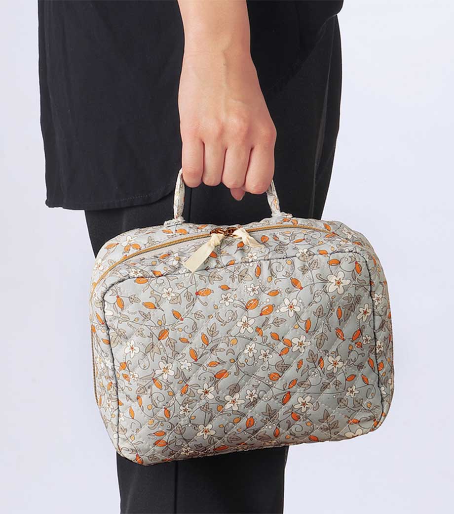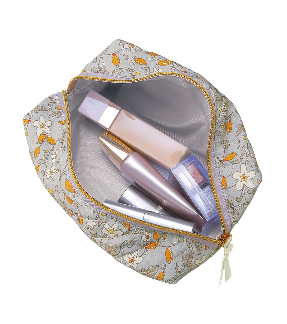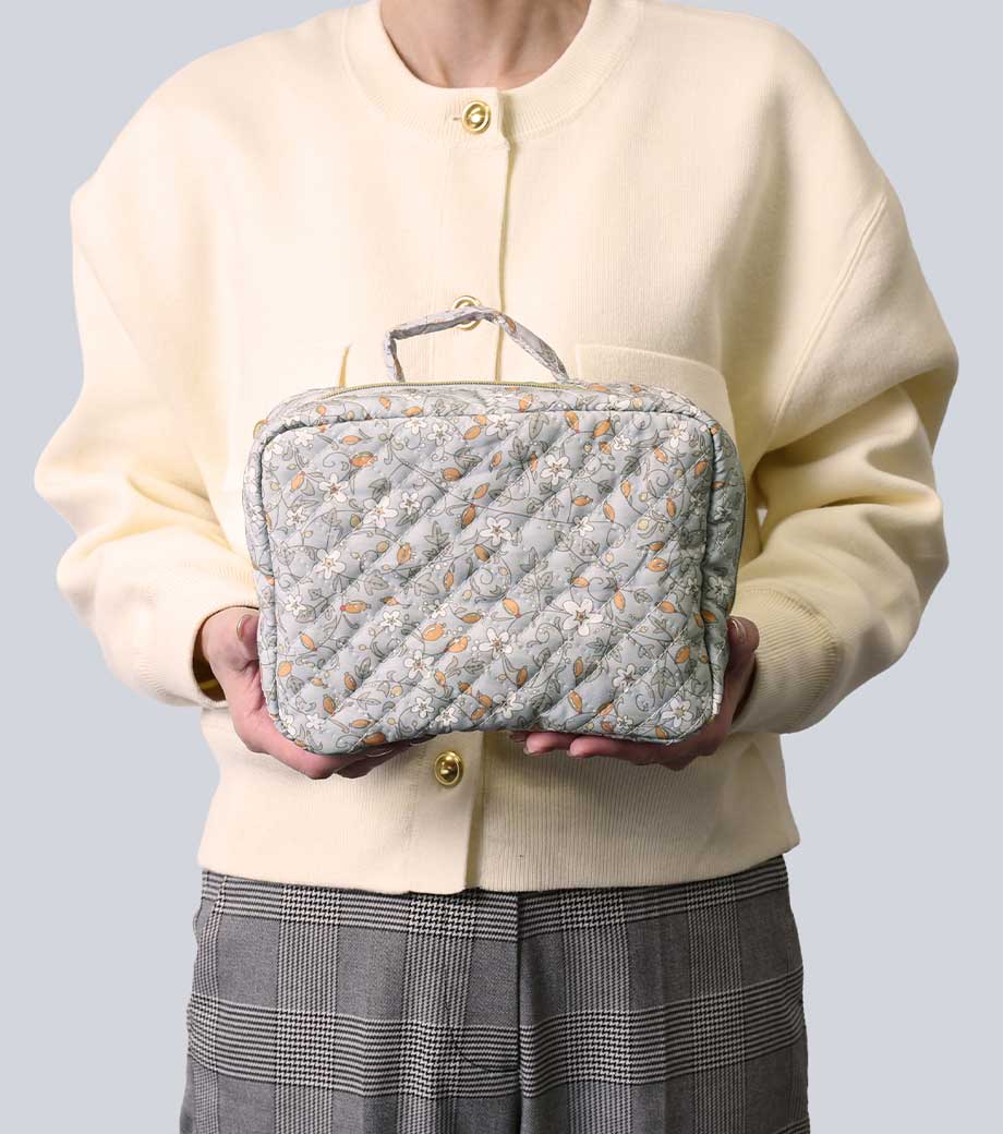 花柄キルティング生地が可愛い大容量ボックスポーチ。中身を出し入れしやすい、がばっと大きく開くタイプです。トラベル用スキンケアアイテムやブラシも入るので旅行に最適。仕分けに便利な内ポケット付きです。持ち歩き便利な持ち手は、洗面台などで掛けておくこともできます。