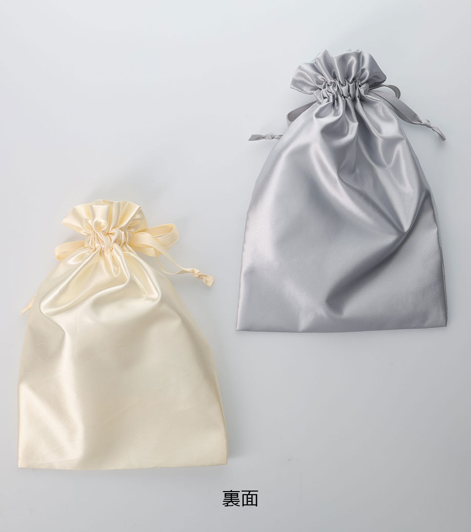 表面下部のサテン生地には名入れが可能で、ショップやブランドロゴを入れたオリジナル巾着を作成できます。