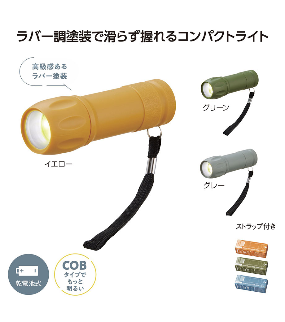 手にしっくりなじむラバー調グリップが特徴のコンパクトライト。軽量設計・ストラップ付きで持ち運びに便利です。COB式の高輝度ライトが広範囲をしっかり照らし、暗所での作業や非常時にも安心。乾電池式なので、停電時や災害時の備えとしてもおすすめです。防災グッズとしてはもちろん、日常使いにも活躍する頼れるライトです。