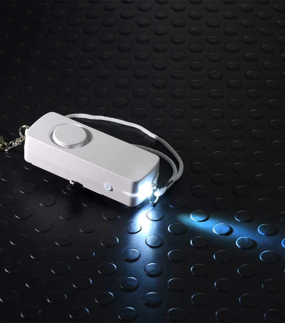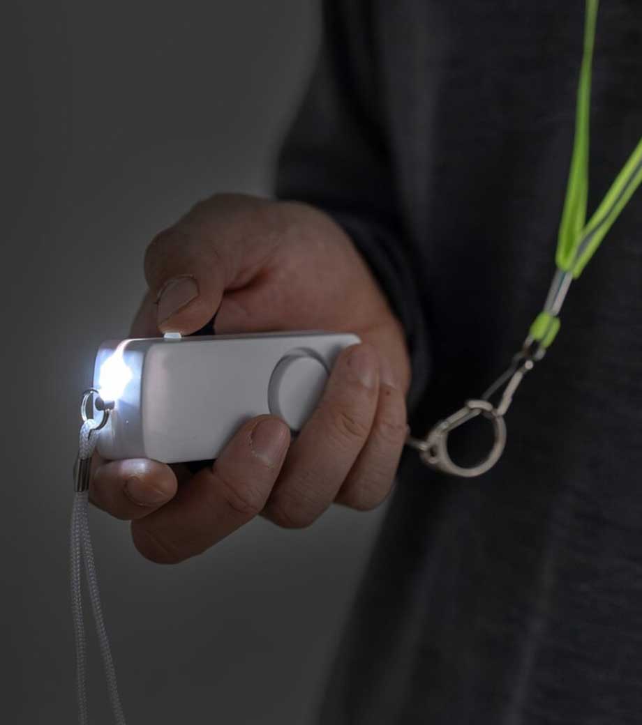 ライトとブザーが一体になった便利な防犯アイテム。防水性能(IPX3)を備え、急な雨でも安心です。落下防止のネックストラップと、バッグやランドセルに簡単に取り付けられるバンド付きで携帯性も抜群。塾や学校での利用はもちろん、アウトドアでも活躍します。1色印刷かフルカラー印刷が可能。地域の防犯キャンペーンのノベルティや防災訓練の参加記念品に最適なノベルティです。