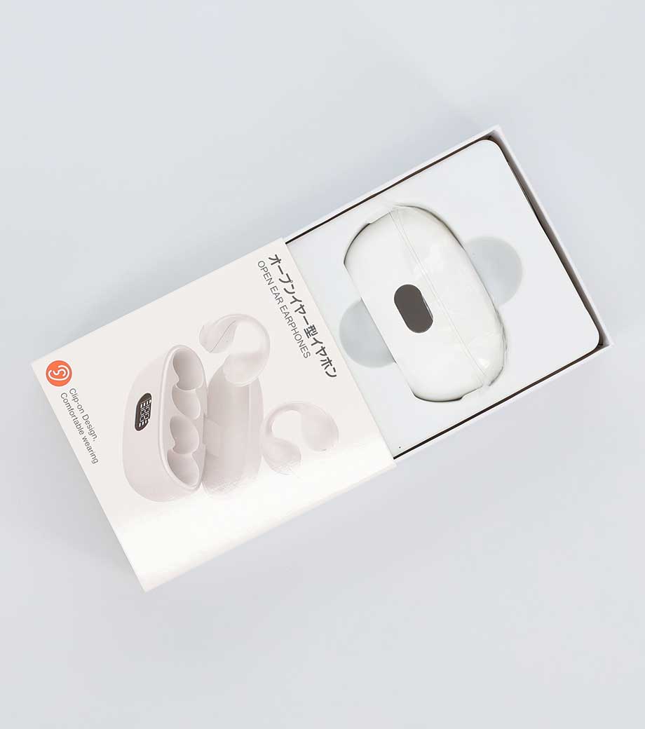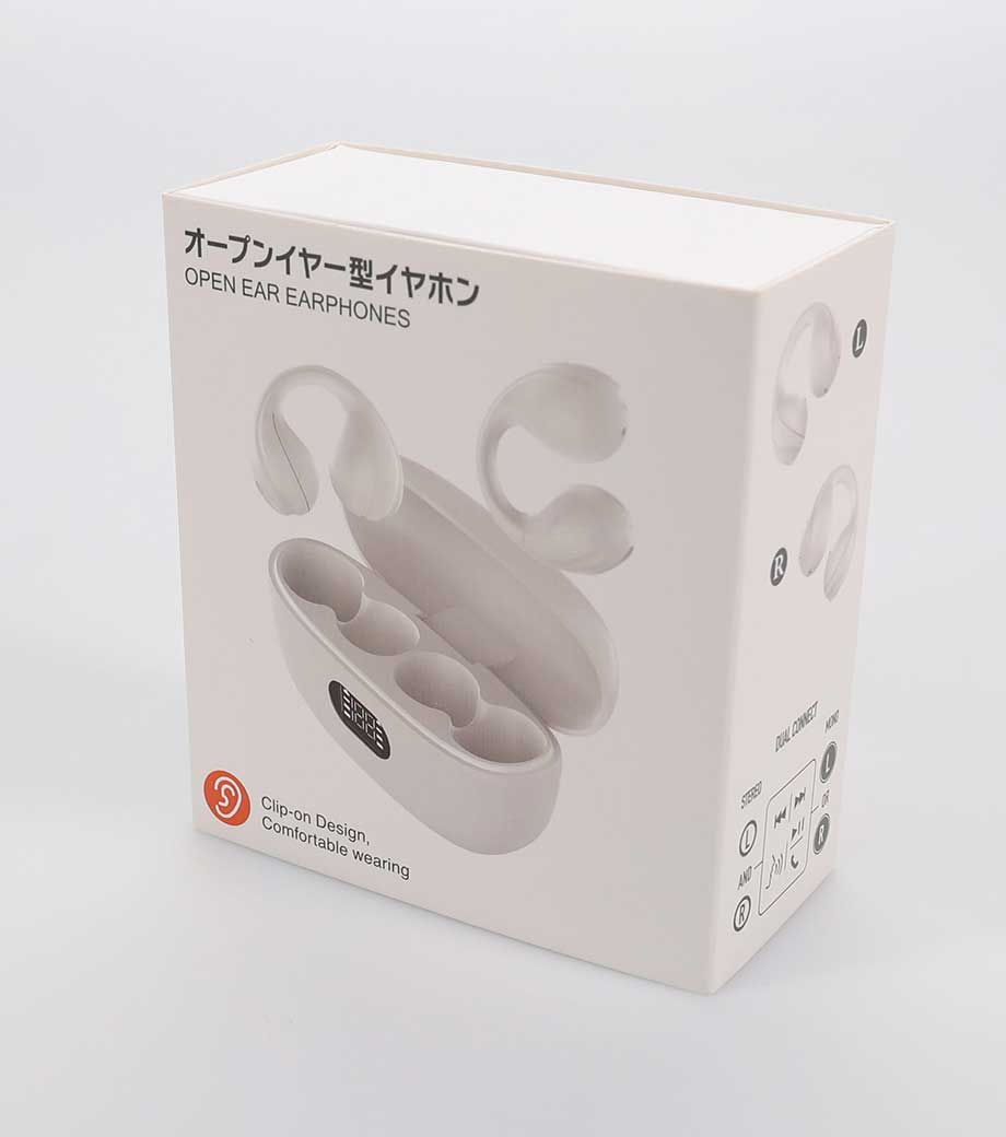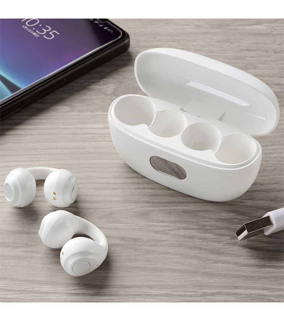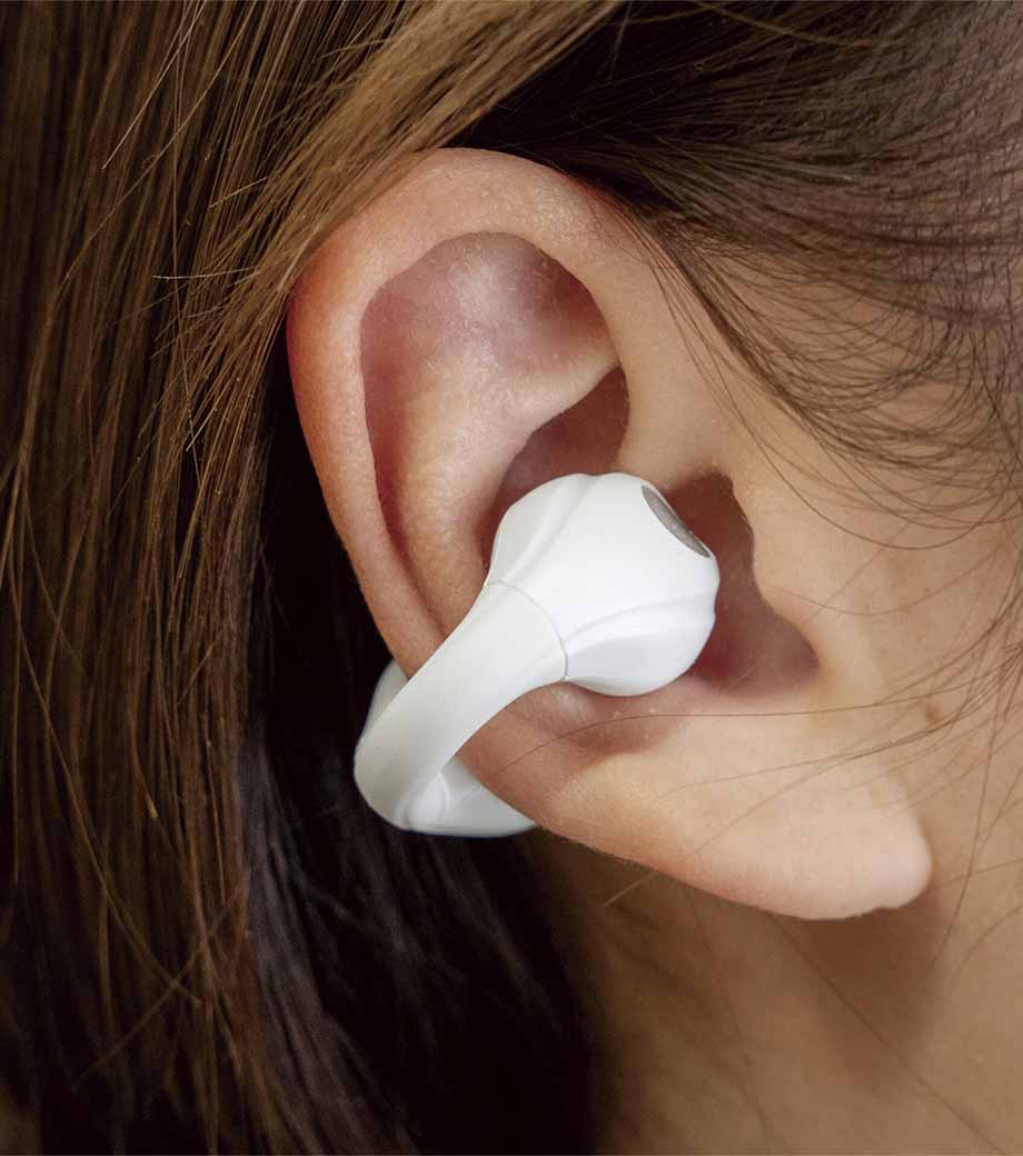 ながら聴きに最適なワイヤレスのイヤーカフ型イヤホン。耳をふさがないので、音楽や通話を楽しみながらも周囲の音も自然に聞こえます。通勤・通学やランニング、家事中に使えて便利。柔らかい素材で耳を挟むように装着するので、長時間使用でも圧迫感がなく快適です。ケースの側面に充電状況を%で示すインジケーター付き。